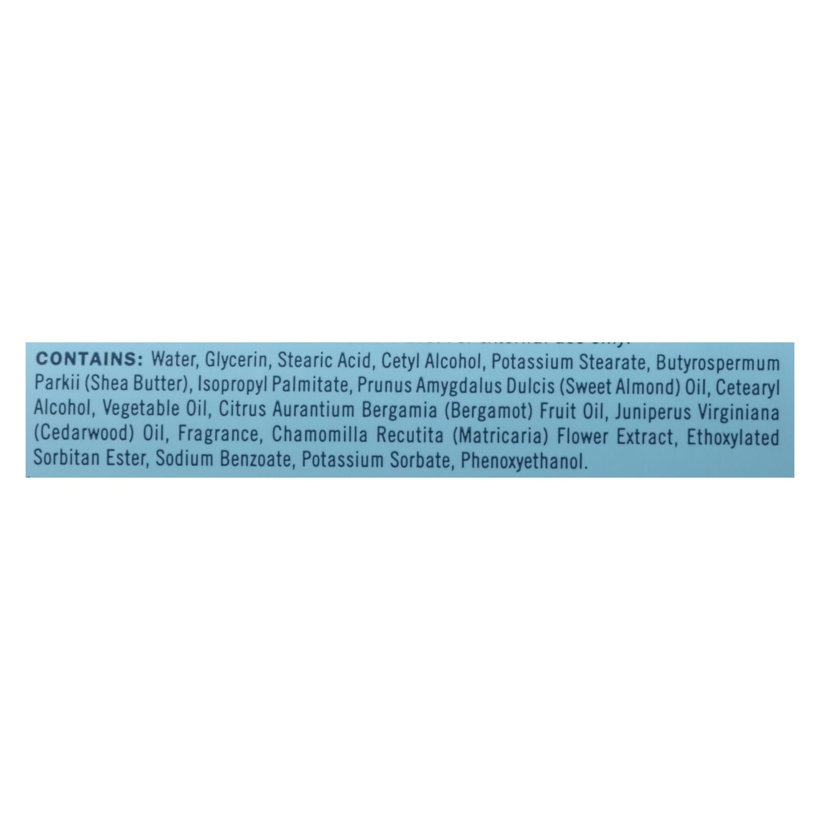 ingredients : water;glycerin;stearic acid;cetyl alcohol;potassium stearate;butyrospermum parkii;shea butter;isopropyl palmitate;prunus amygdalus dulcis;sweet almond;oil;cetearyl alcohol;vegetable oil;citrus aurantium bergamia;bergamot;fruit oil;juniperus virginiana;cedarwood;fragrance;chamomilla recutita;matricaria;flower extract;ethoxylated sorbitan ester;sodium benzoate;potassium sorbate;phenoxyethanol