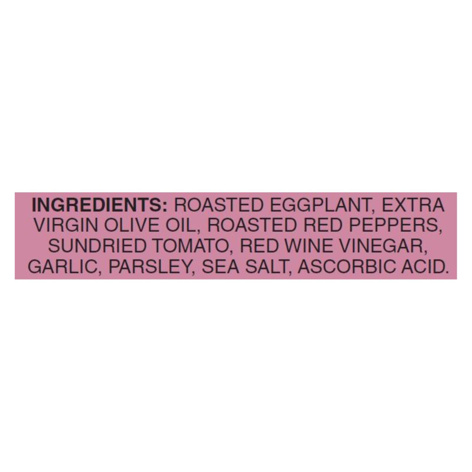 ingredients : roasted eggplant;extra virgin olive oil;roasted red peppers;sundried tomato;red wine vinegar;garlic;parsley;sea salt;ascorbic acid