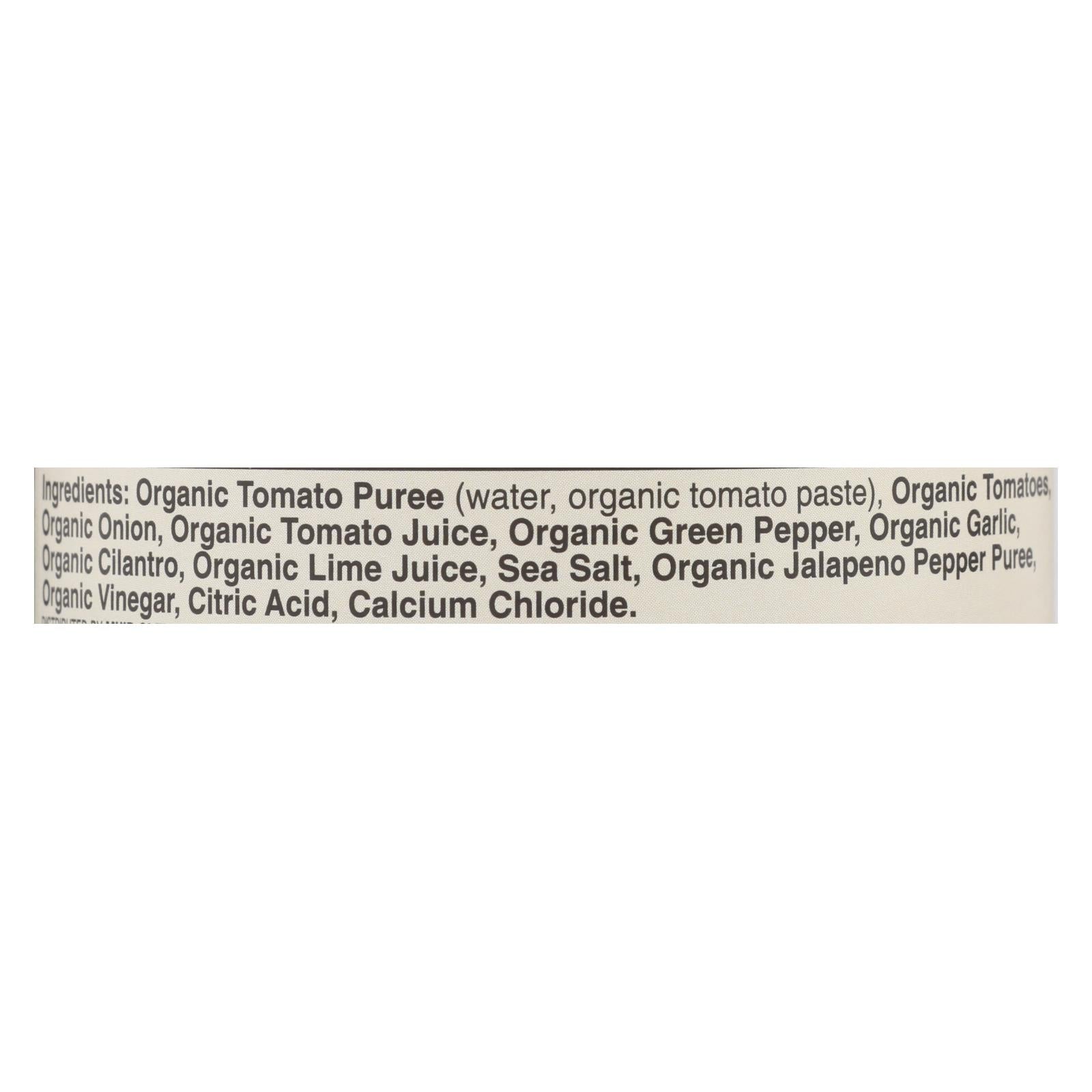 ingredients : organic tomato puree;water;organic tomato paste;organic tomatoes;organic onion;organic tomato juice;organic green pepper;organic garlic;organic cilantro;organic lime juice;sea salt;organic jalapeno pepper puree;organic vinegar;citric acid;calcium chloride