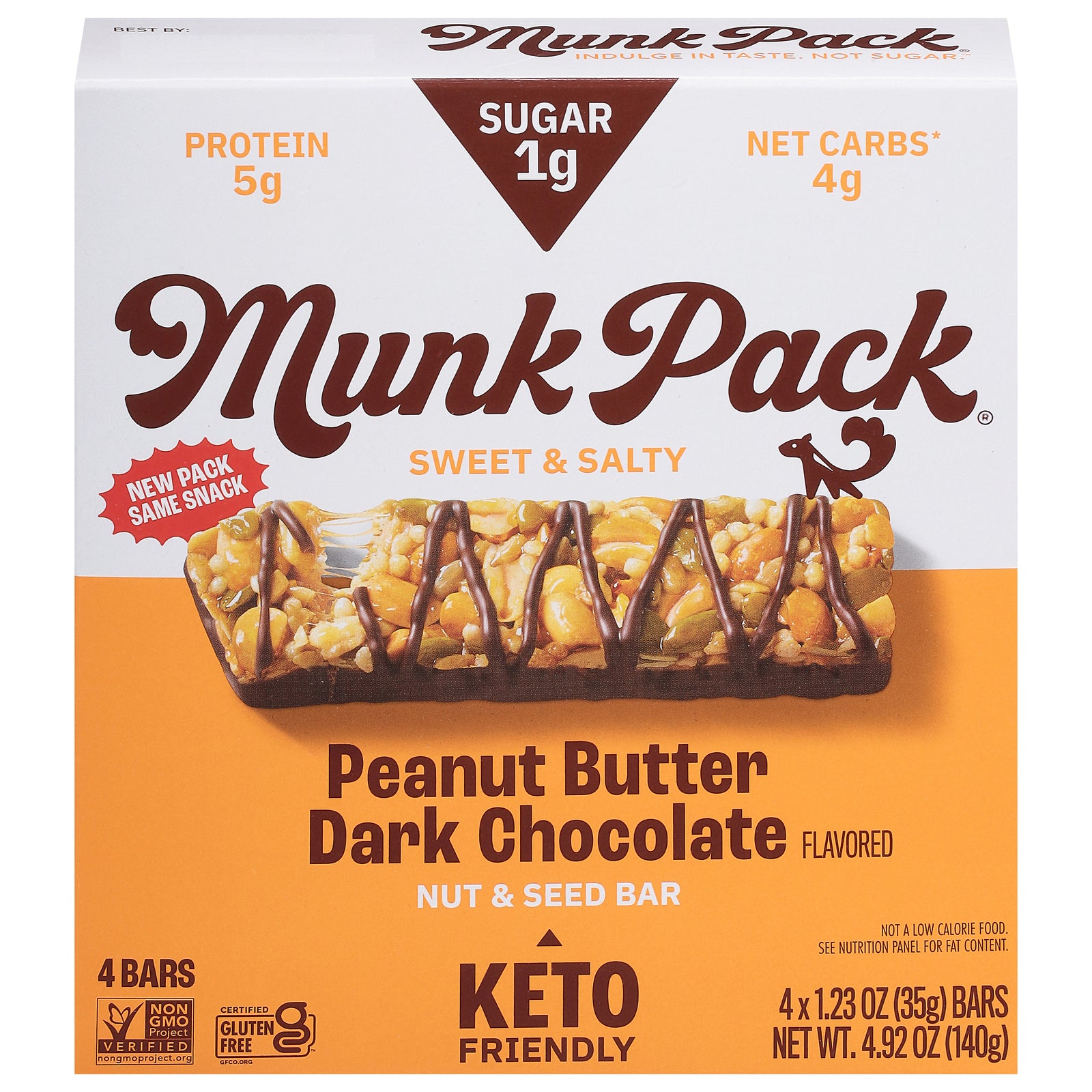 Sweet & salty! your world is what you make it. Choose your adventure. Take chances. Fuel your life. Sold by weight, not volume. Michelle & toby. Our goal through munk pack is to empower you to lead an active, well-balanced lifestyle. We see a world where happiness is cultivated by connecting with nature and taking good care of your body. Enjoy! our peanut butter dark chocolate flavored keto nut & seed bar lets you enjoy the delicious taste of peanut butter and chocolate, but with none of the guilt. Crunchy peanuts and creamy peanut butter are covered in a chocolatey drizzle for ultimate snack break bliss. Please recycle this carton after use.