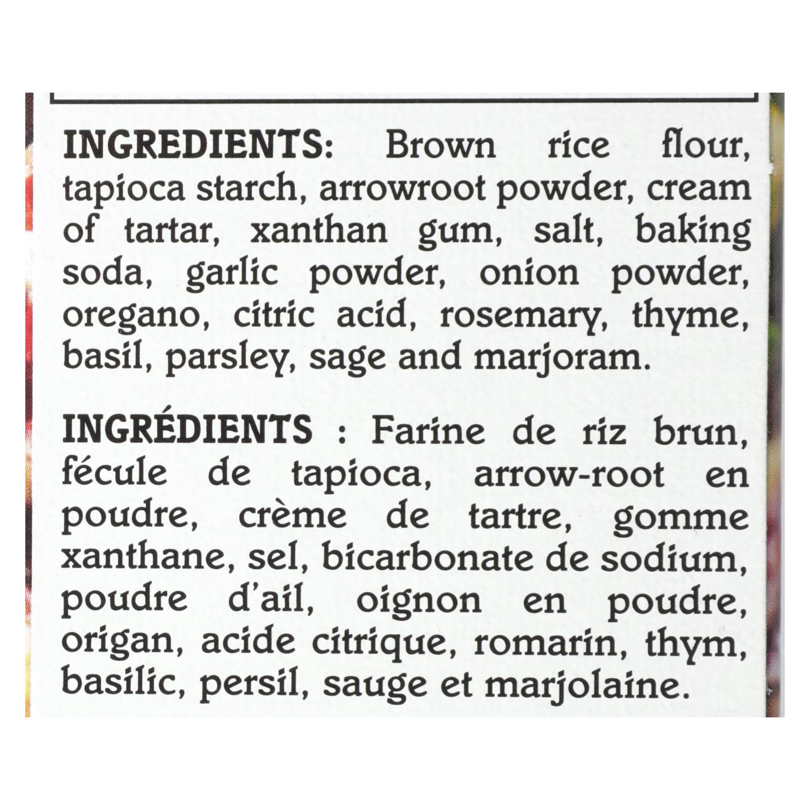 ingredients : brown rice flour;tapioca starch;arrowroot powder;cream of tartar;xanthan gum;salt;baking soda;garlic powder;onion powder;oregano;citric acid;rosemary;thyme;basil;parsley;sage and marjoram