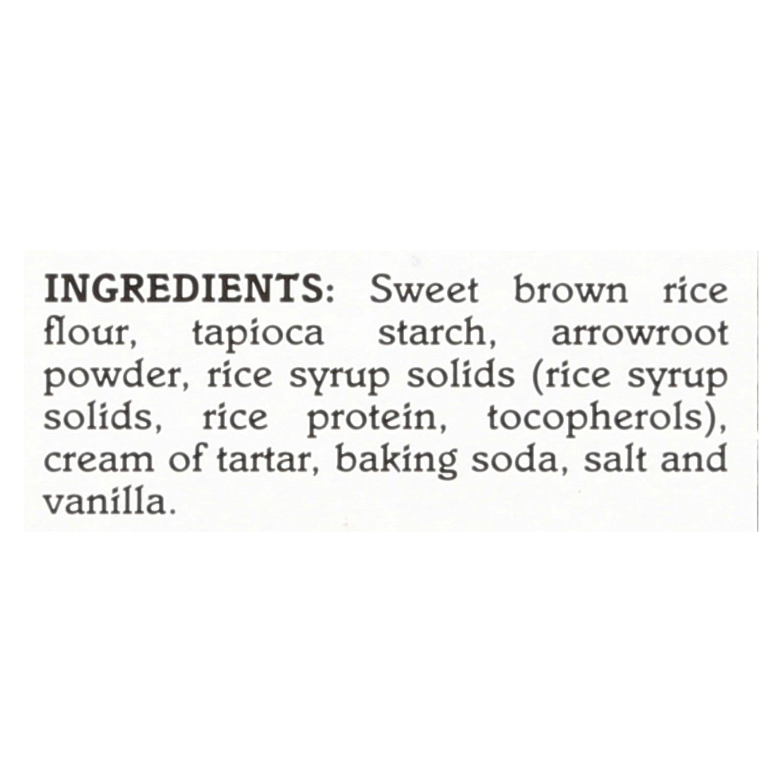 ingredients : sweet brown rice flour;tapioca starch;arrowroot powder;rice syrup solids;rice protein;tocopherols;cream of tartar. Baking soda;salt and vanilla