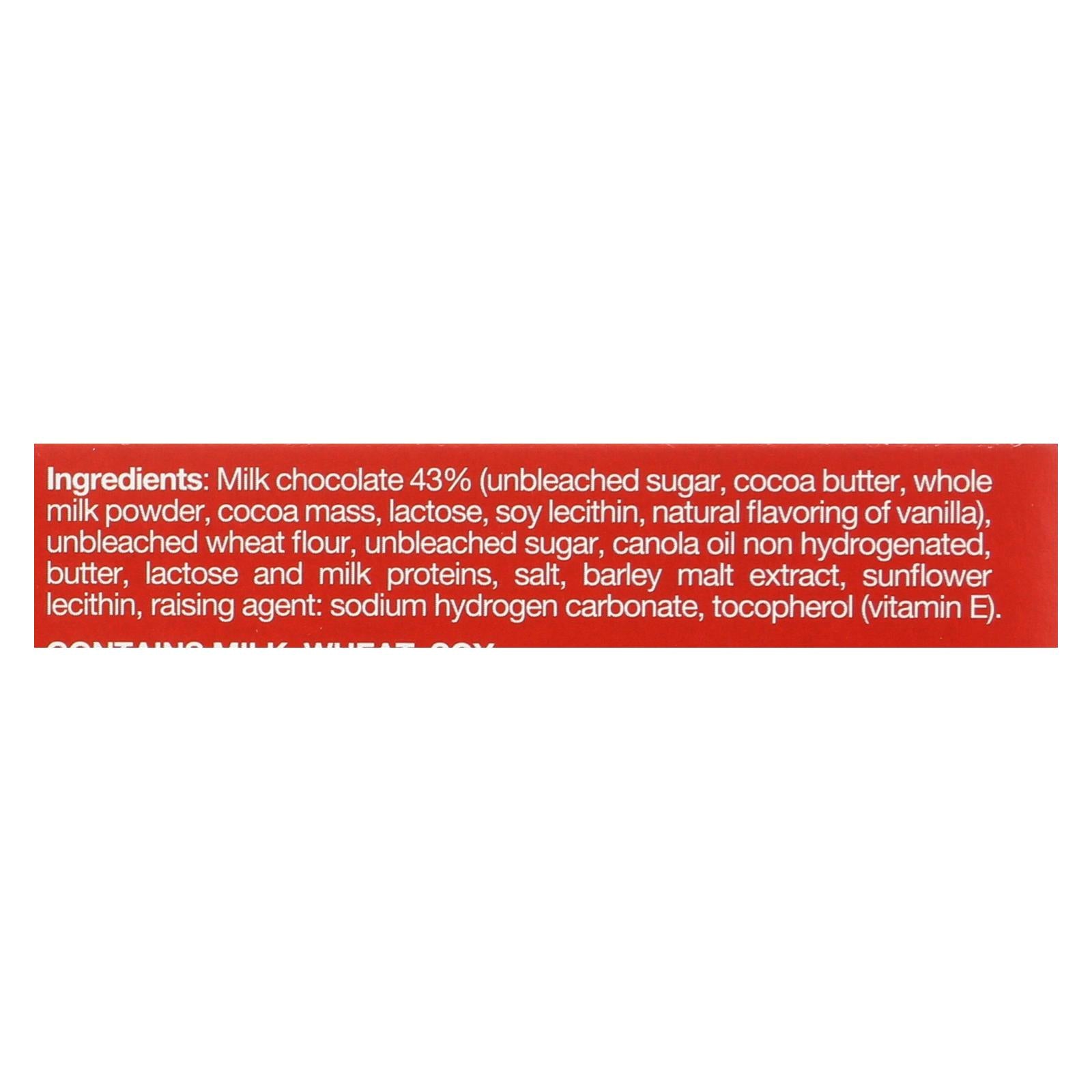 ingredients : milk chocolate 43%;unbleached sugar;cocoa butter;whole milk powder;cocoa mass;lactose;soy lecithin;natural flavoring of vanilla;unbleached wheat flour;canola oil non hydrogenated;butter;lactose and milk proteins;salt;barley malt extract;sunflower lecithin;raising agent: sodium hydrogen carbonate;tocopherol;vitamin e