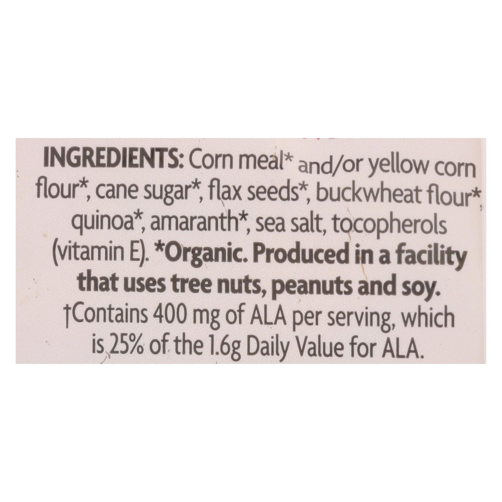 ingredients : corn meal* and/or yellow corn flour;cane sugar;flax seeds;buckwheat flour;quinoa;amaranth;sea salt;tocopherols;vitamin e