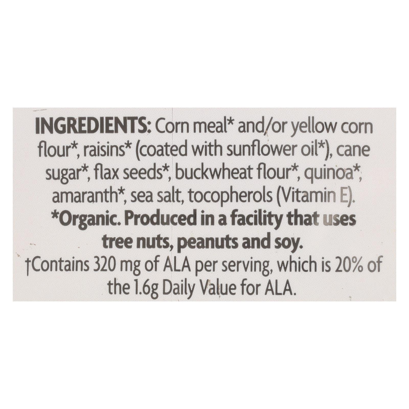 ingredients : corn meal* and/or yellow corn flour;raisin;coated with sunflower oil;cane sugar;flax seeds;buckwheat flour;quinoa;amaranth;sea salt;tocopherols;vitamin e