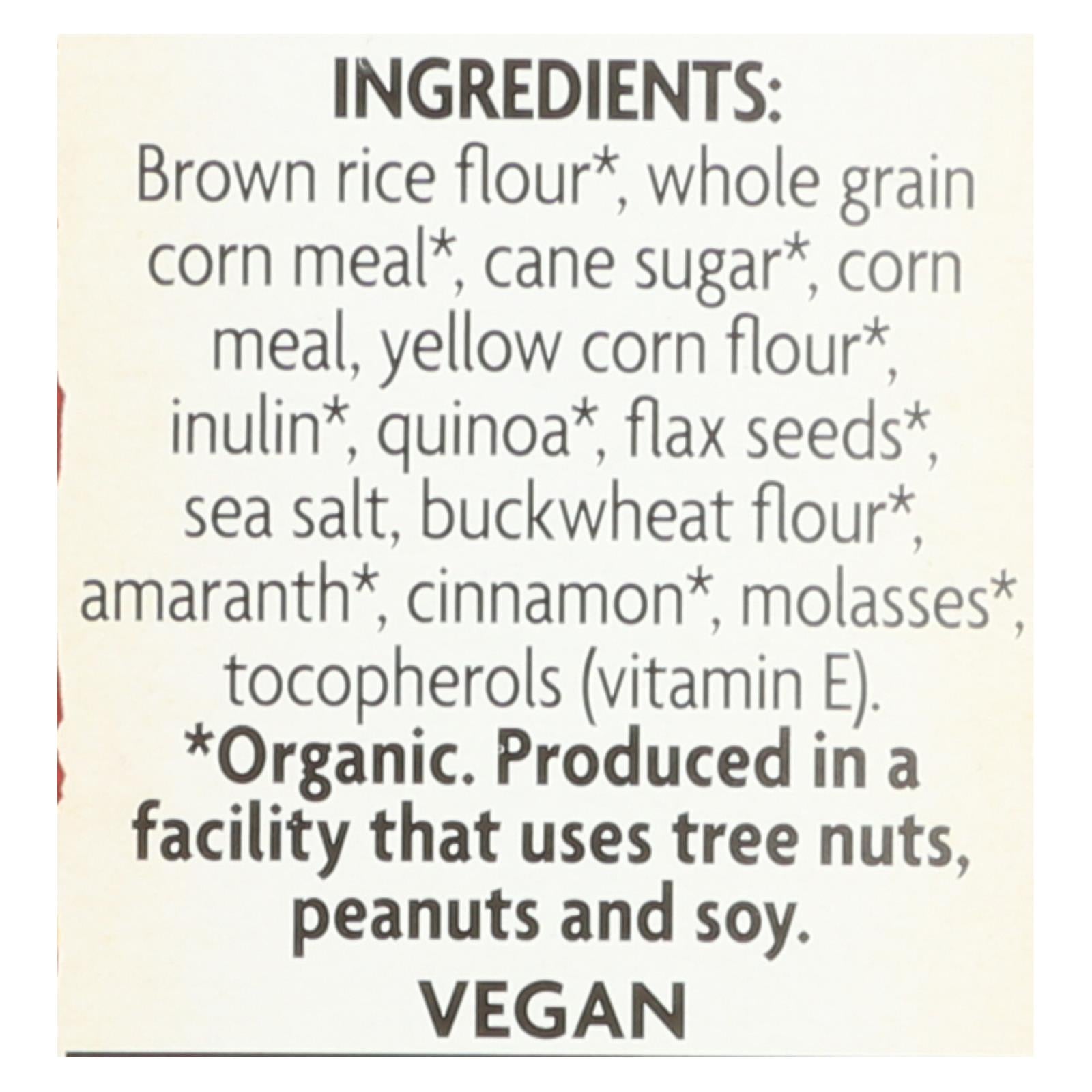 ingredients : brown rice flour;whole grain corn meal;cane sugar;corn meal;yellow corn flour;inulin;quinoa;flax seeds;sea salt;buckwheat flour;amaranth;cinnamon;molasses;tocopherols;vitamin e