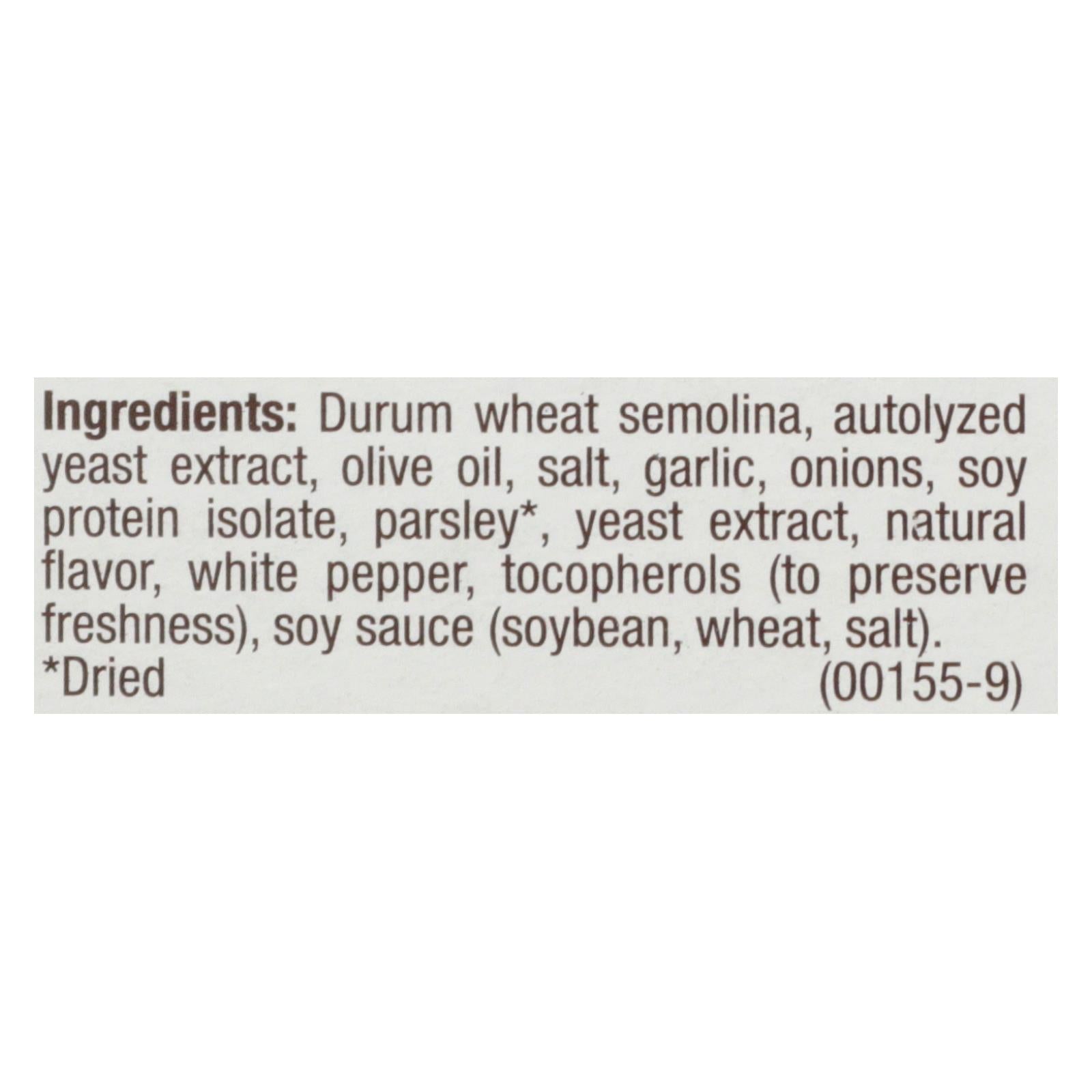 ingredients : durum wheat semolina;autolyzed yeast extract;olive oil;salt;garlic;onions;soy protein isolate;parsley;yeast extract;natural flavor;white pepper;tocopherols;to preserve freshness;soy sauce;soybean;wheat