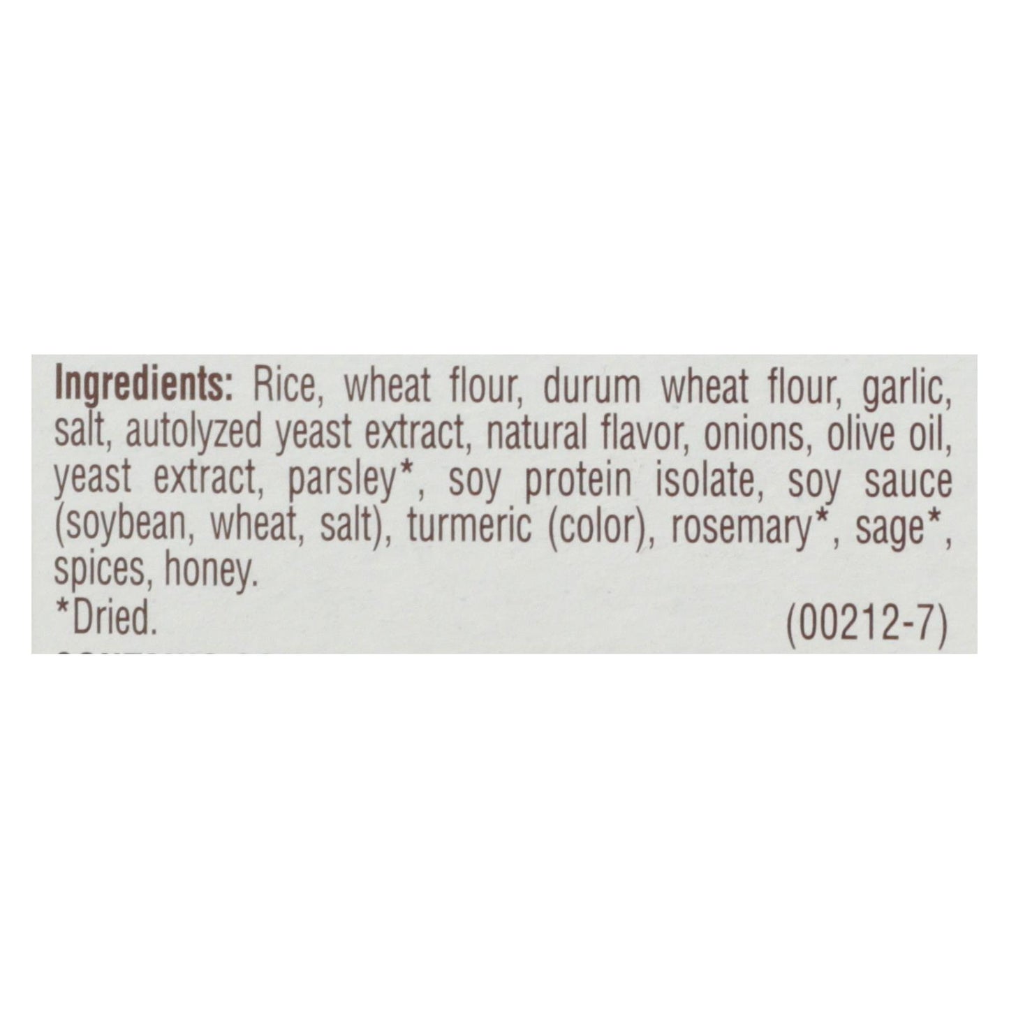 ingredients : rice;wheat flour;durum wheat flour;garlic;salt;autolyzed yeast extract;natural flavor;onions;olive oil;yeast extract;parsley;soy protein isolate;soy sauce;soybean;wheat;turmeric;color;rosemary;sage;spices;honey