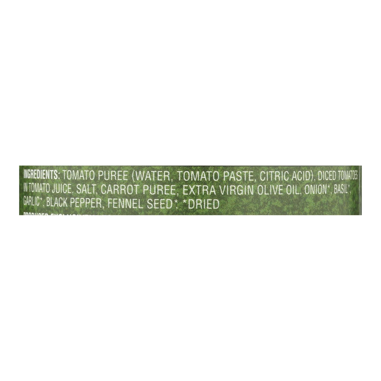 ingredients : tomato puree (water, tomato paste);diced tomatoes in tomato juice;extra virgin olive oil;sea salt;onion;basil;garlic;citric acid;black pepper;fennel seed