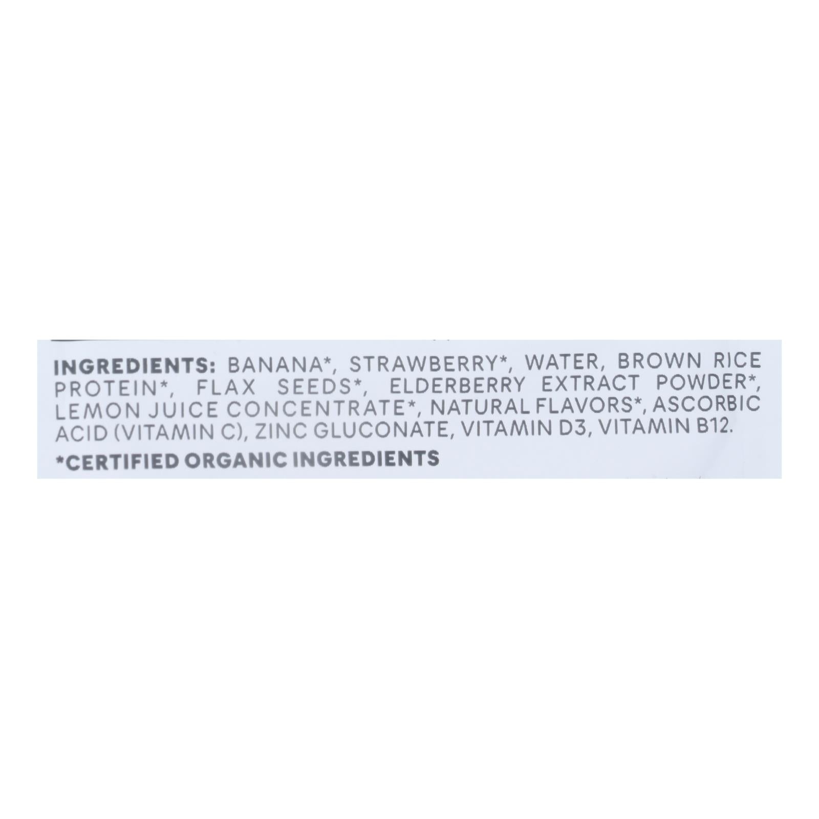 ingredients : banana;strawberry;water;brown rice protein;flax seeds;elderberry extract powder;lemon juice concentrate;natural flavors;ascorbic acid (vitamin c);zinc gluconate;vitamin d3;vitamin b12