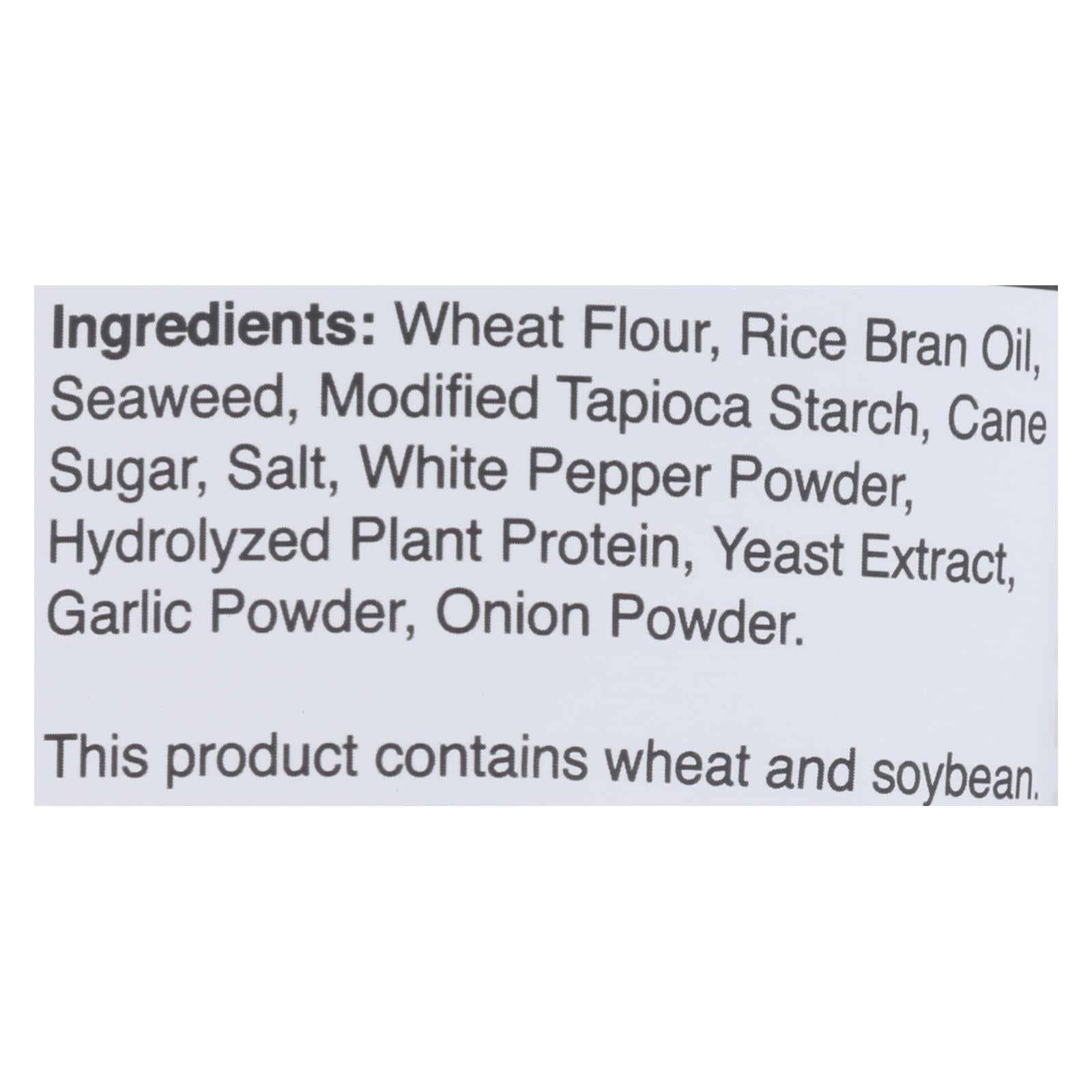 ingredients : wheat flour;rice bran oil;seaweed;modified tapioca starch;cane sugar;salt;white pepper powder;hydrolyzed plant protein;yeast extract;garlic powder;onion powder
