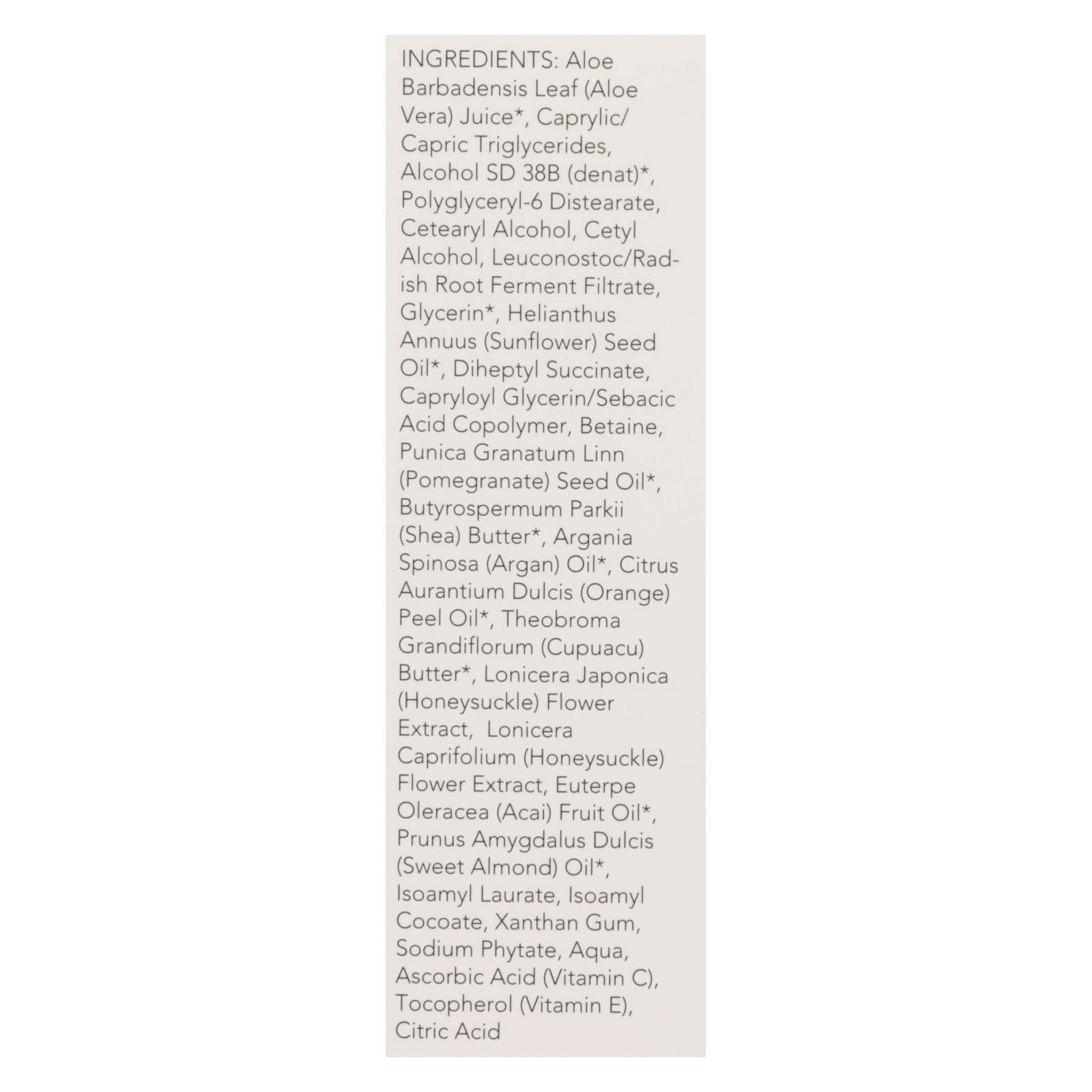 ingredients : aloe barbadensis leaf;aloe vera;juice;caprylic/capric triglycerides;alcohol sd 38b;denat;polyglyceryl-6 distearate;cetearyl alcohol;cetyl alcohol;leuconostoc/radish root ferment filtrate;glycerin;helianthus annuus;sunflower;seed oil;diheptyl succinate;capryloyl glycerin/sebacic acid copolymer;betaine;punica granatum linn;pomegranate;butyrospermum parkii;shea;butter;argania spinosa;argan;oil;citrus aurantium dulcis;orange;peel oil;theobroma grandiflorum;cupuacu;lonicera japonica;honeysuckle;flowe