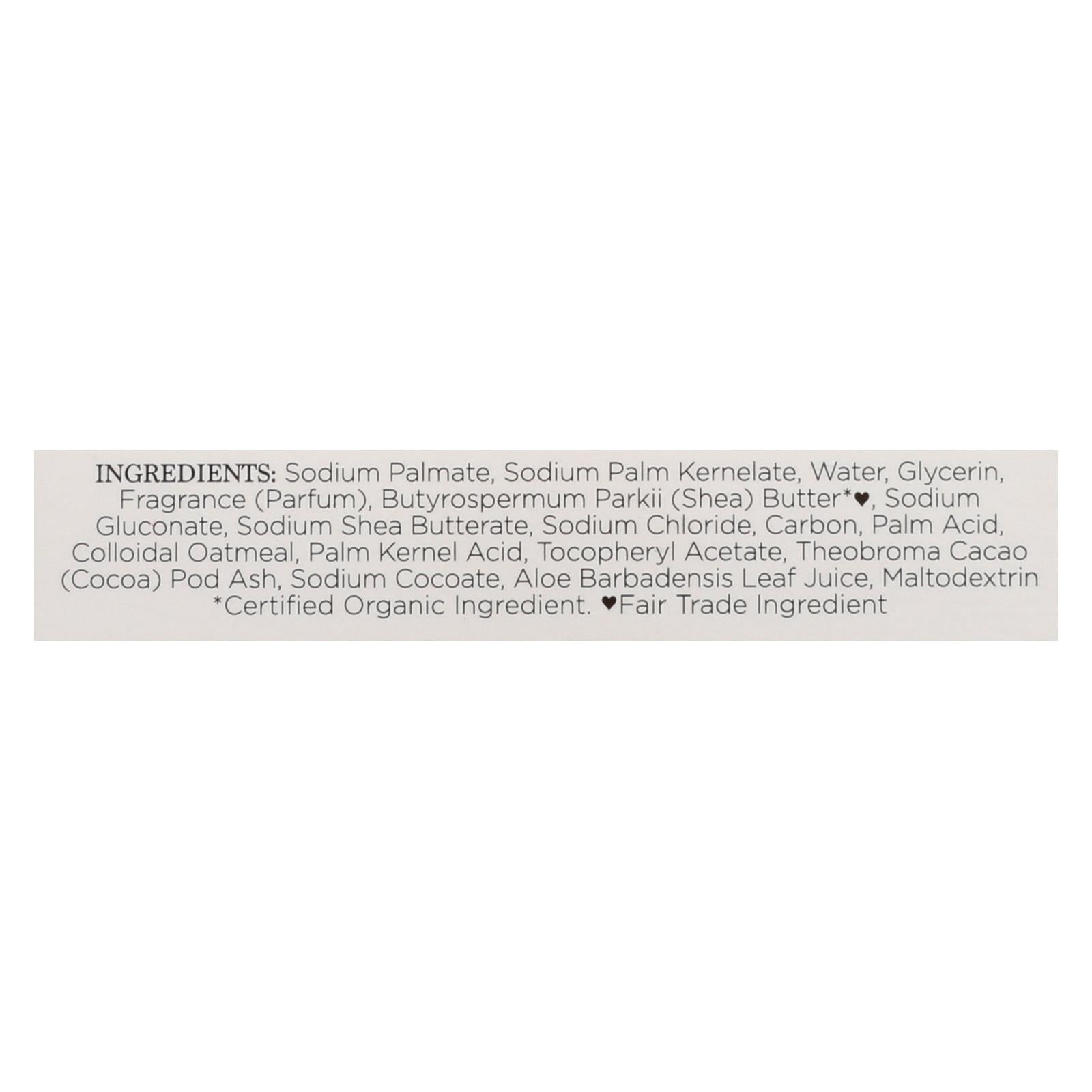 ingredients : sodium palmate;sodium kernelate;water;glycerin;fragrance;parfum;butyrospermum parkii;shea;butter*♥;sodium gluconate;sodium shea butterate;sodium chloride;carbon;palm acid;colloidal oatmeal;palm kernel acid;tocopheryl acetate;theobroma cacao;cocoa;pod ash;sodium cocoate;aloe barbadensis leaf juice;maltodextrin