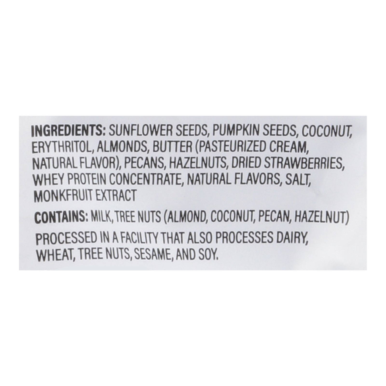 ingredients : sunflower seeds;pumpkin seeds;coconut;erythritol;almonds;butter (pasteurized cream, natural flavor);pecans;hazelnuts;dried strawberries;whey protein concentrate;natural flavors;salt;monkfruit extract
