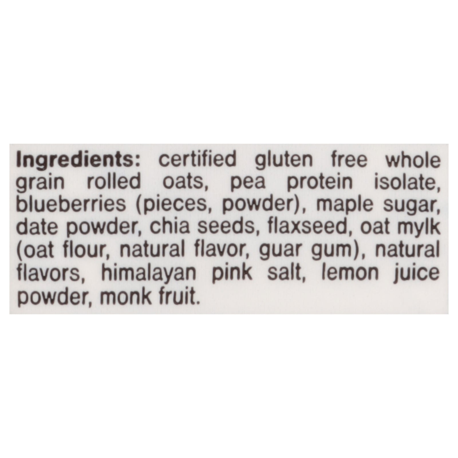 ingredients : certified gluten free whole grain rolled oats;pea protein isolate;oat mylk (oat flour, guar gum, natural flavor);powdered dates;maple sugar;blueberries (powder, whole);chia seeds;hemp hearts;natural flavors;himalayan pink salt;monk fruit