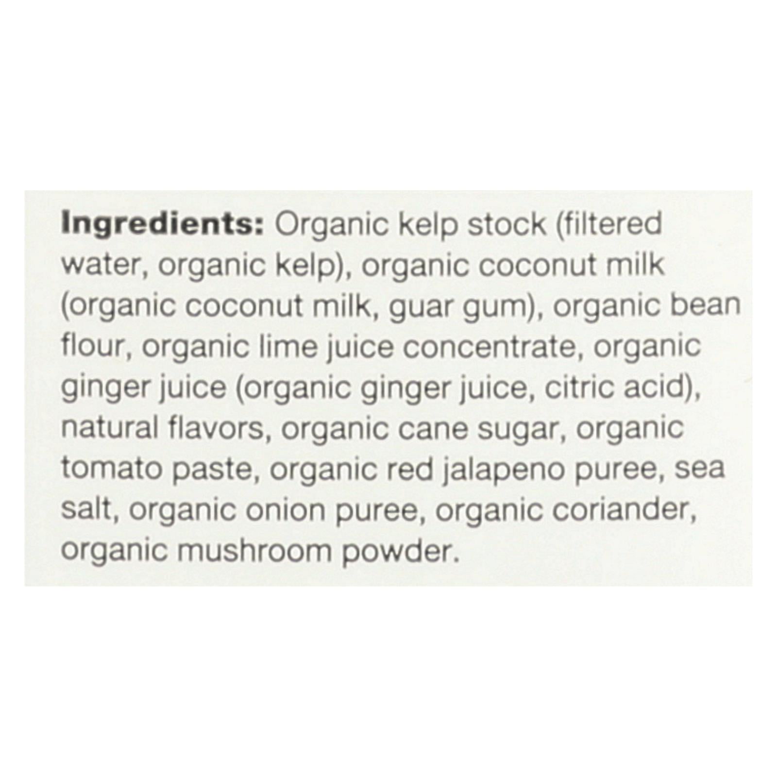ingredients : organic kelp stock;filtered water;organic kelp;organic coconut milk;guar gum;organic bean flour;organic lime juice concentrate;organic ginger juice;citric acid;natural flavors;organic cane sugar;organic tomato paste;organic red jalapeno puree;sea salt;organic onion puree;organic coriander;organic mushroom powder