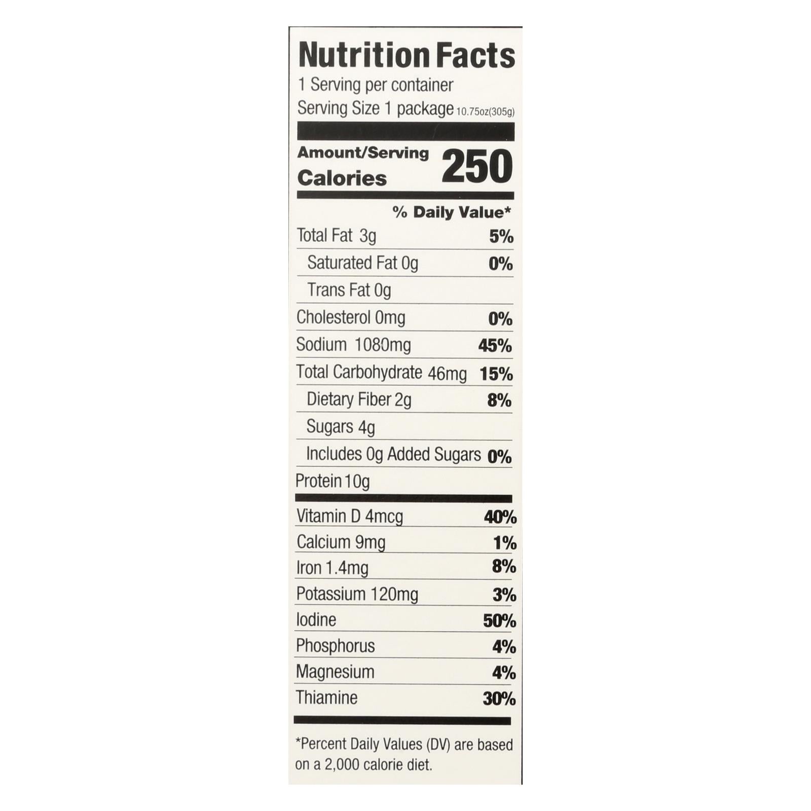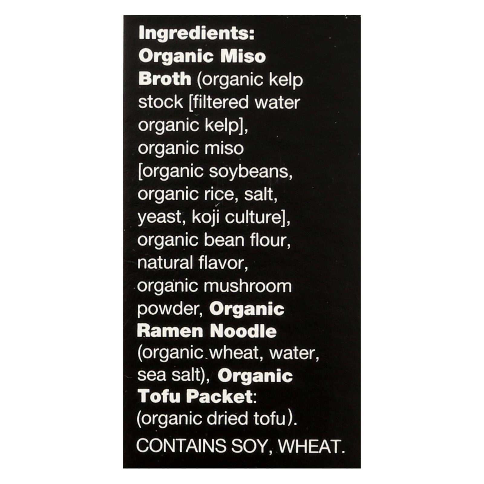 ingredients : organic miso broth filtered water;organic white miso [organic soybeans, organic rice, salt, yeast, koji culture];organic bean flour;natural flavor;pacific kombu(kelp) extract [water, kelp, salt];organic mushroom powder;organic ramen noodle organic wheat flour;water;sea salt;organic shichimi togarashi packet organic cayenne pepper;organic dried orange peel;organic sesame seeds;organic dried ginger;organic dried kelp;organic white pepper;organic vegetable packet organic dried carrot;organic dried