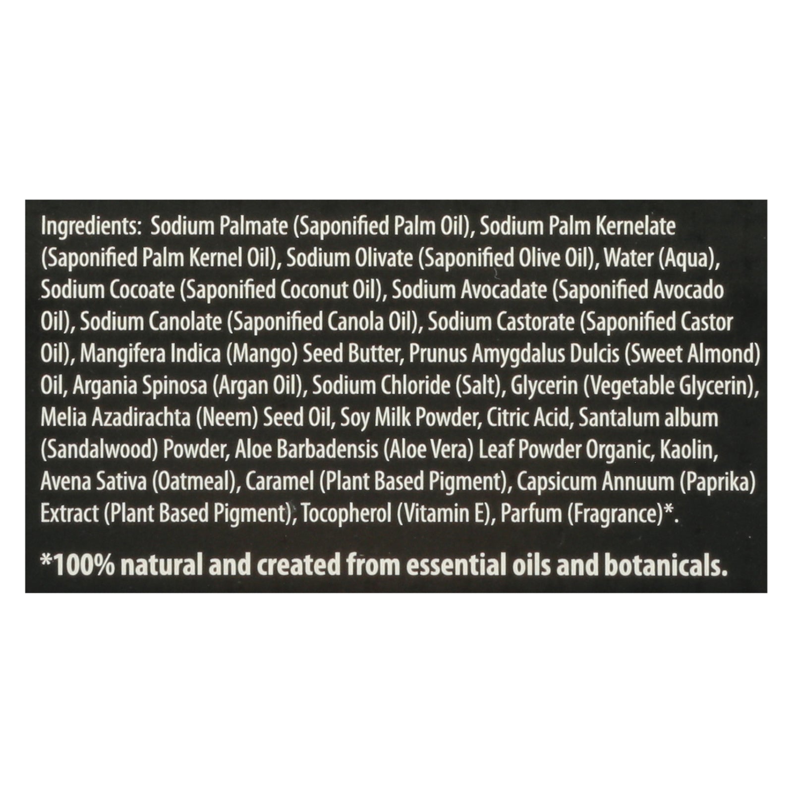 ingredients : sodium palmate;saponified palm oil;sodium palm kernelate;saponified palm kernel oil;sodium olivate;saponified olive oil;water;aqua;sodium cocoate;saponified coconut oil;sodium avocadate;saponified avocado oil;sodium canolate;saponified canola oil;sodium castorate;saponified castor oil;mangifera indica;mango;seed butter;prunus amygdalus dulcis;sweet almond;oil;argania spinosa;argan oil;sodium chloride;salt;glycerin;vegetable glycerin;melia azadirachta;neem;seed oil;soy milk powder;citric acid;san