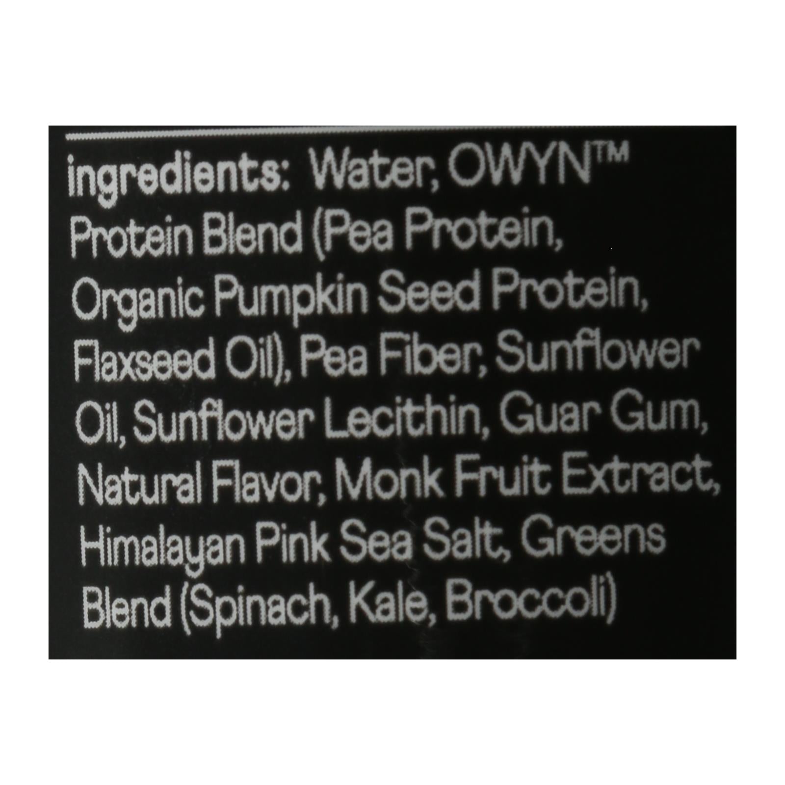 ingredients : water;owyn™ protein blend (pea protein, organic pumpkin seed protein, flaxseed oil);pea fiber;sunflower oil;sunflower lecithin;guar gum;natural flavor;monk fruit extract;himalayan pink sea salt;greens blend (spinach, kale, broccoli)