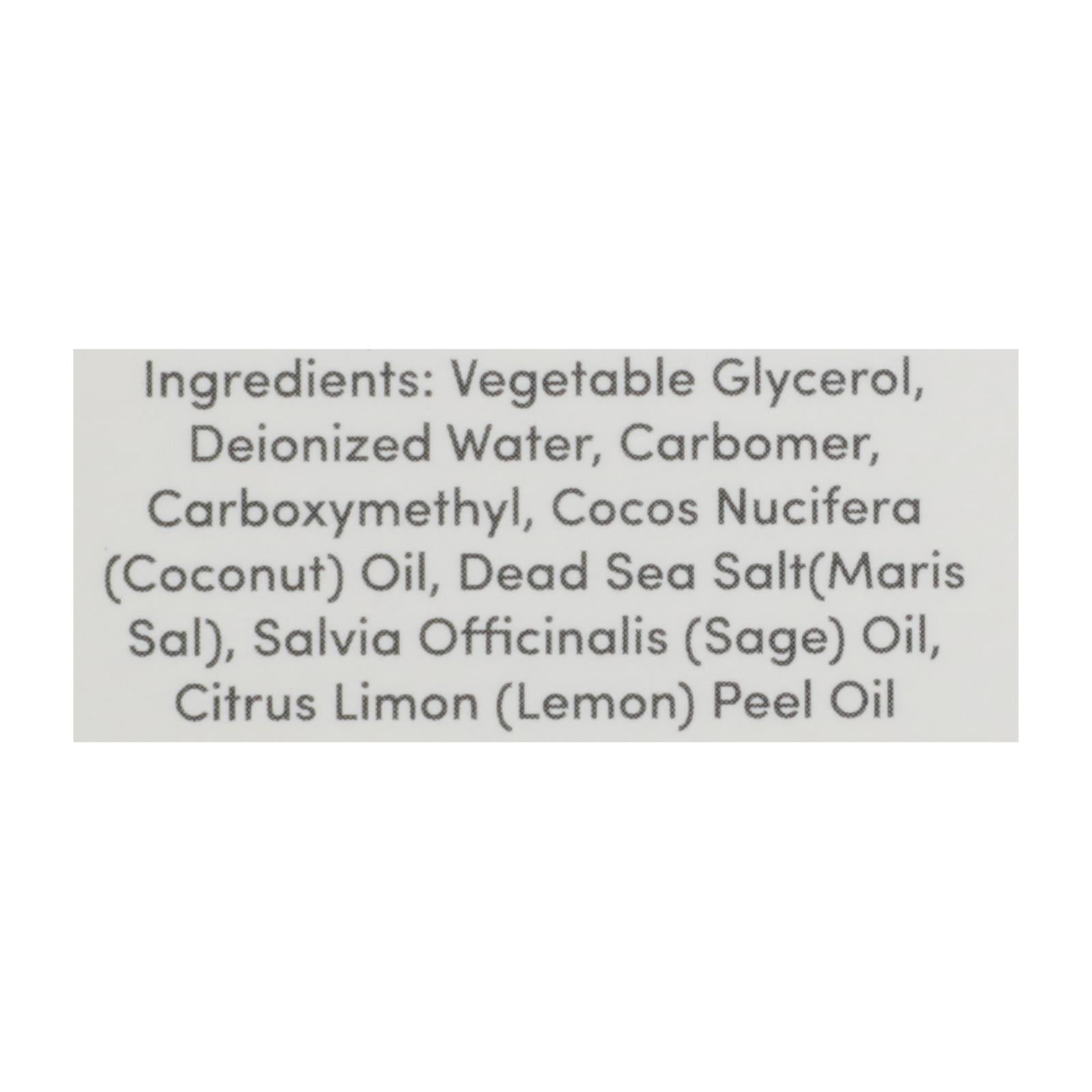 ingredients : vegetable glycerol;deionized water;carbomer;carboxymethyl;cocos nucifera;coconut;oil;dead sea salt;maris sal;salvia officinalis;sage;citrus limon;lemon;peel oil
