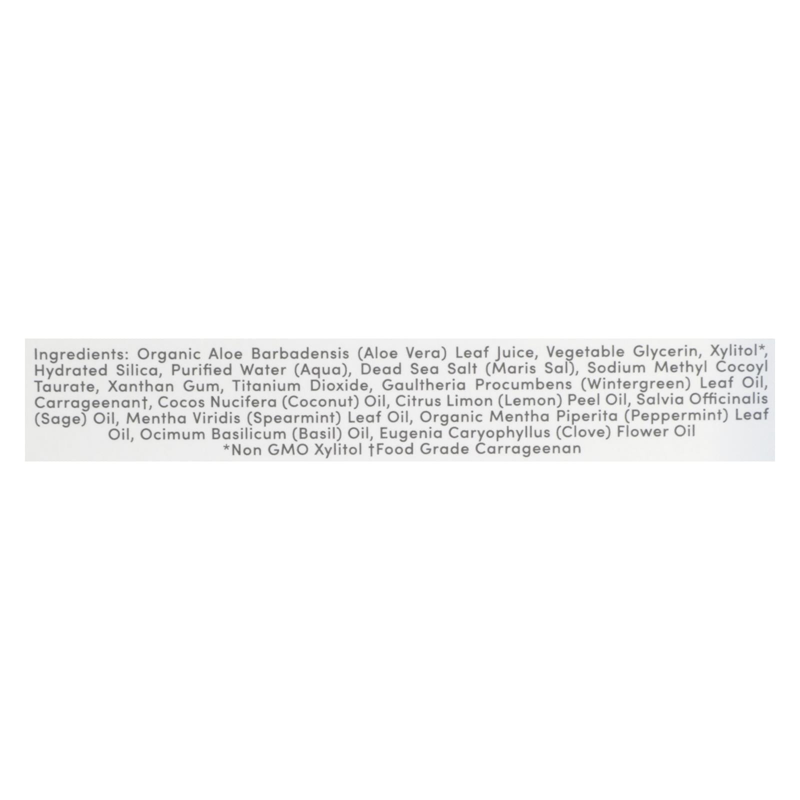 ingredients : organic aloe barbadensis;aloe vera;leaf juice;vegetable glycerin;xylitol;hydrated silica;purified water;aqua;dead sea salt;maris sal;sodium methyl cocoyl taurate;xanthan gum;titanium dioxide;gaultheria procumbens;wintergreen;leaf oil;carrageenan;cocos nucifera;coconut;oil;citrus limon;lemon;peel oil;salvia officinalis;sage;mentha viridis;spearmint;organic mentha piperita;peppermint;ocimum basilicum;basil;eugenia caryophyllus;clove;flower oil