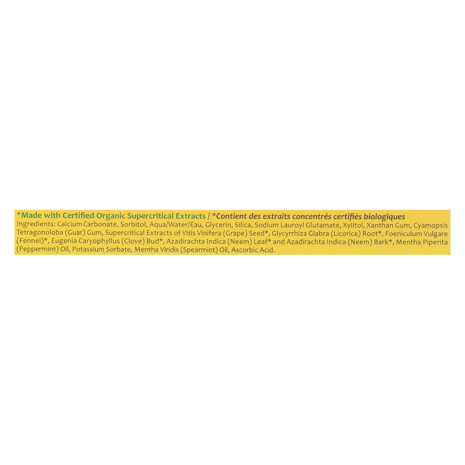 ingredients : calcium carbonate;sorbitol;aqua/water/eau;glycerin;silica;sodium lauroyl glutamate;xylitol;xanthan gum;cyamopsis tetragonoloba;guar;gum;supercritical extracts of vitis vinifera;grape;seed;glycyrrhiza glabra;licorice;root;foeniculum vulgare;fennel;eugenia caryophyllus;clove;bud;azadirachta indica;neem;leaf* and azadirachta indica;bark;mentha piperita;peppermint;oil;potassium sorbate;mentha viridis;spearmint;ascorbic acid