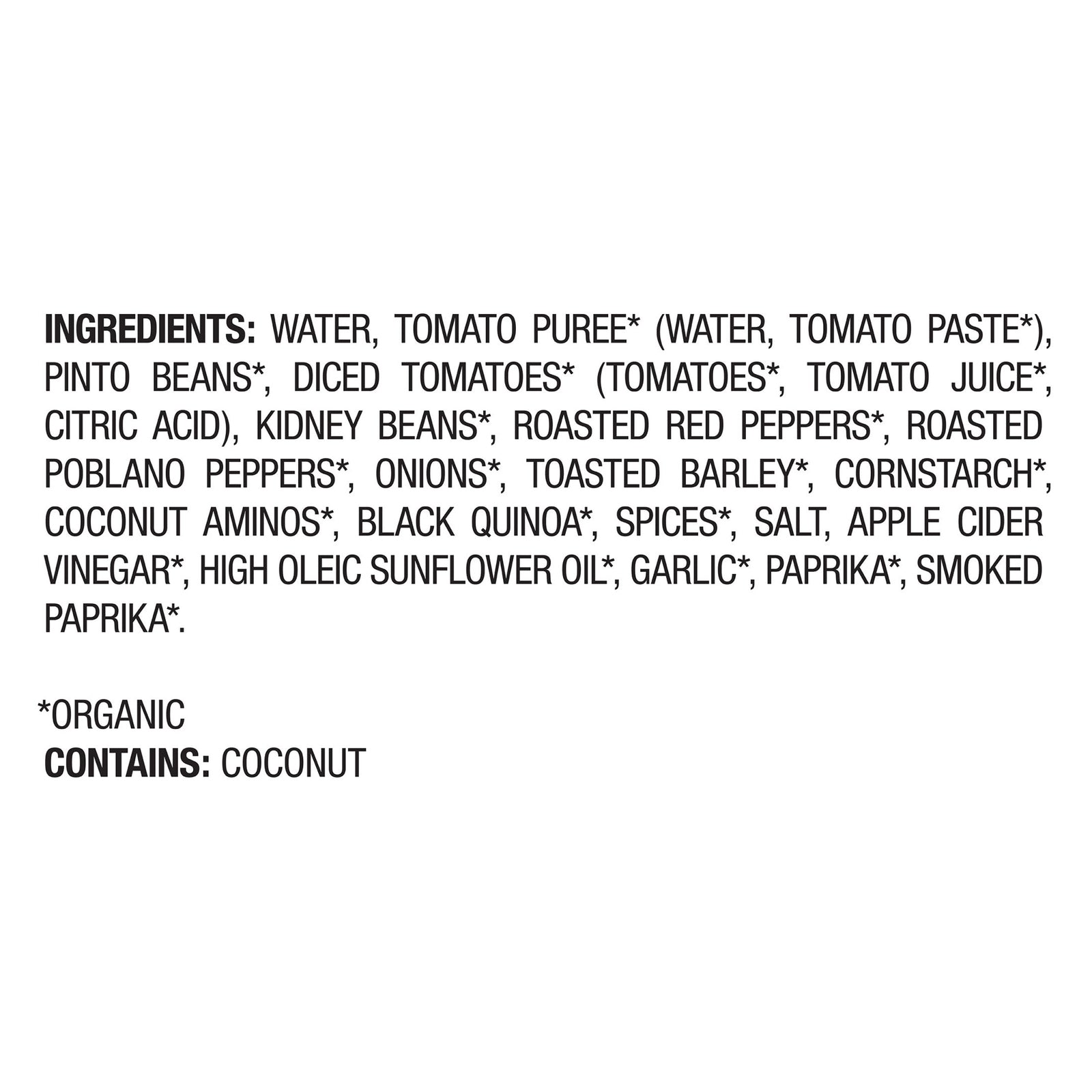 ingredients : water;tomato puree* (water, tomato paste*);pinto beans;diced tomatoes* (tomatoes*, tomato juice*, citric acid);kidney beans;roasted red peppers;roasted poblano peppers;onions;toasted barley;cornstarch;coconut aminos;black quinoa;spices;salt;apple cider vinegar;high oleic sunflower oil;garlic;paprika;smoked paprika