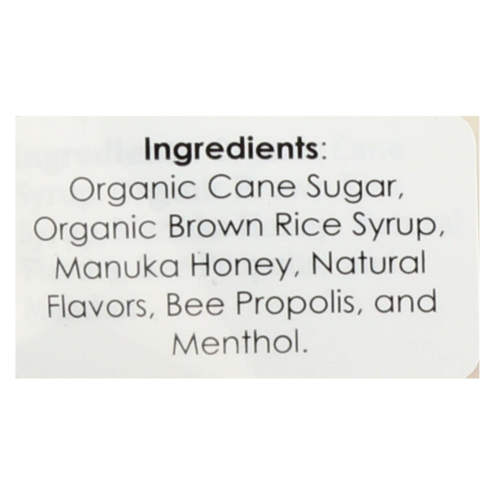 ingredients : organic cane sugar;organic brown rice syrup;manuka honey;natural flavors;bee propolis;and menthol