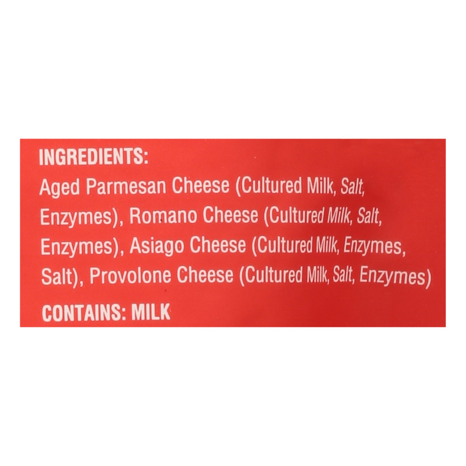ingredients : aged parmesan cheese (cultured milk, salt, enzymes);romano cheese (cultured milk, salt, enzymes);asiago cheese (cultured milk, enzymes, salt);provolone cheese (cultured milk, salt, enzymes)
