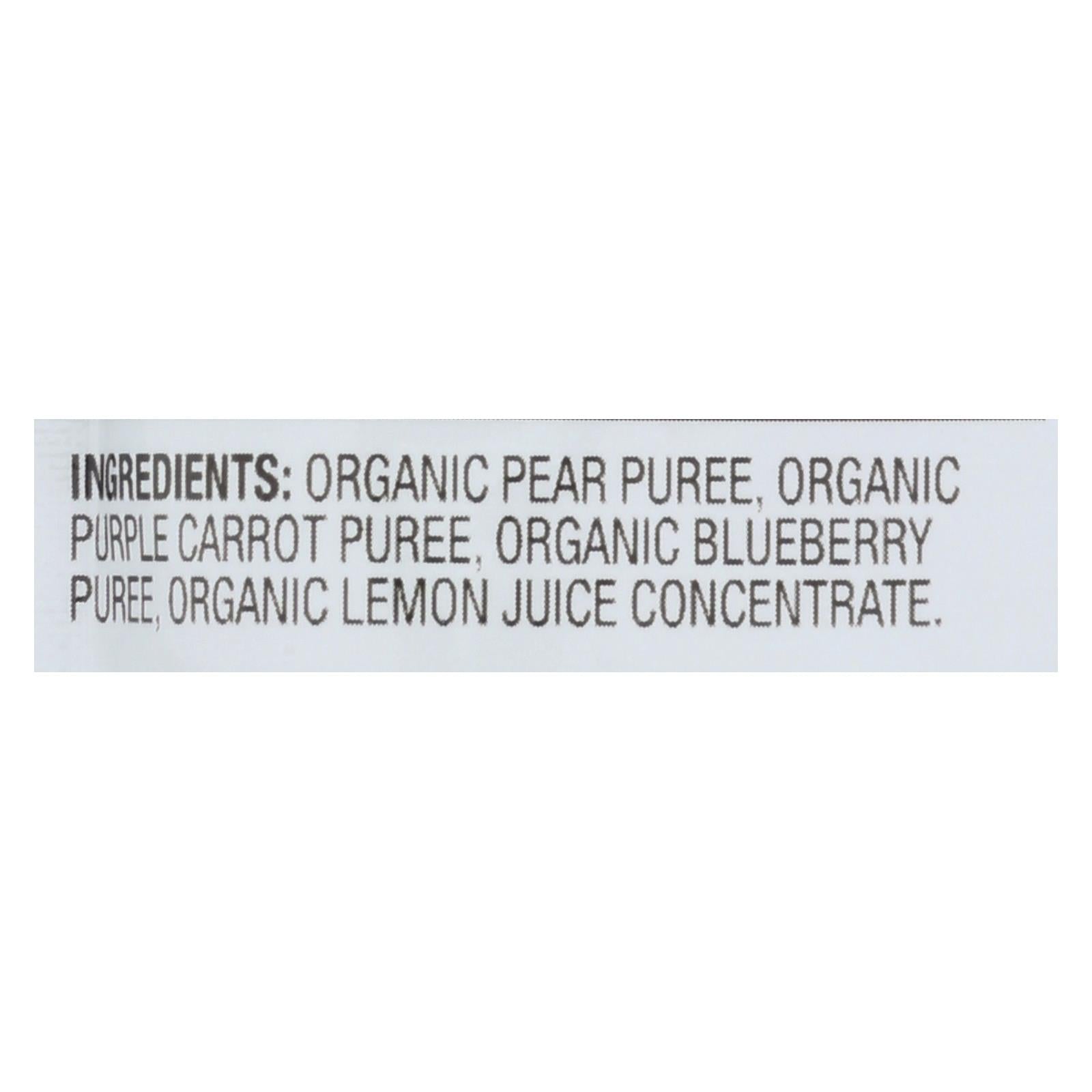 ingredients : organic pear puree;organic puree carrot puree;organic blueberry puree;organic lemon juice concentrate