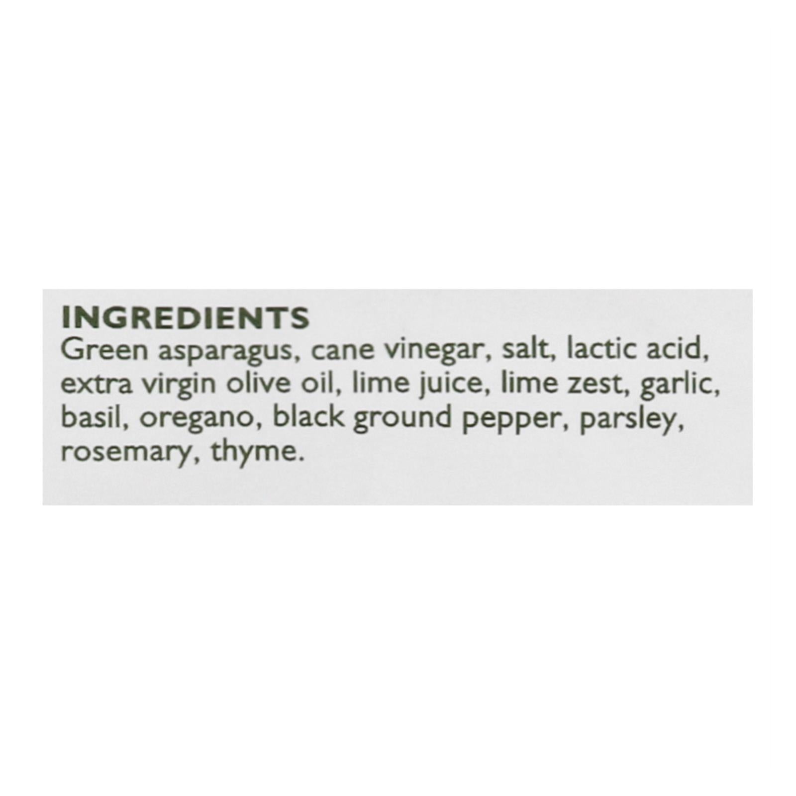 ingredients : green asparagus, cane vinegar, salt, lactic acid, extra virgin olive oil, lime juice, lime zest, garlic, basil, oregano, black ground pepper, parsley, rosemary, thyme.