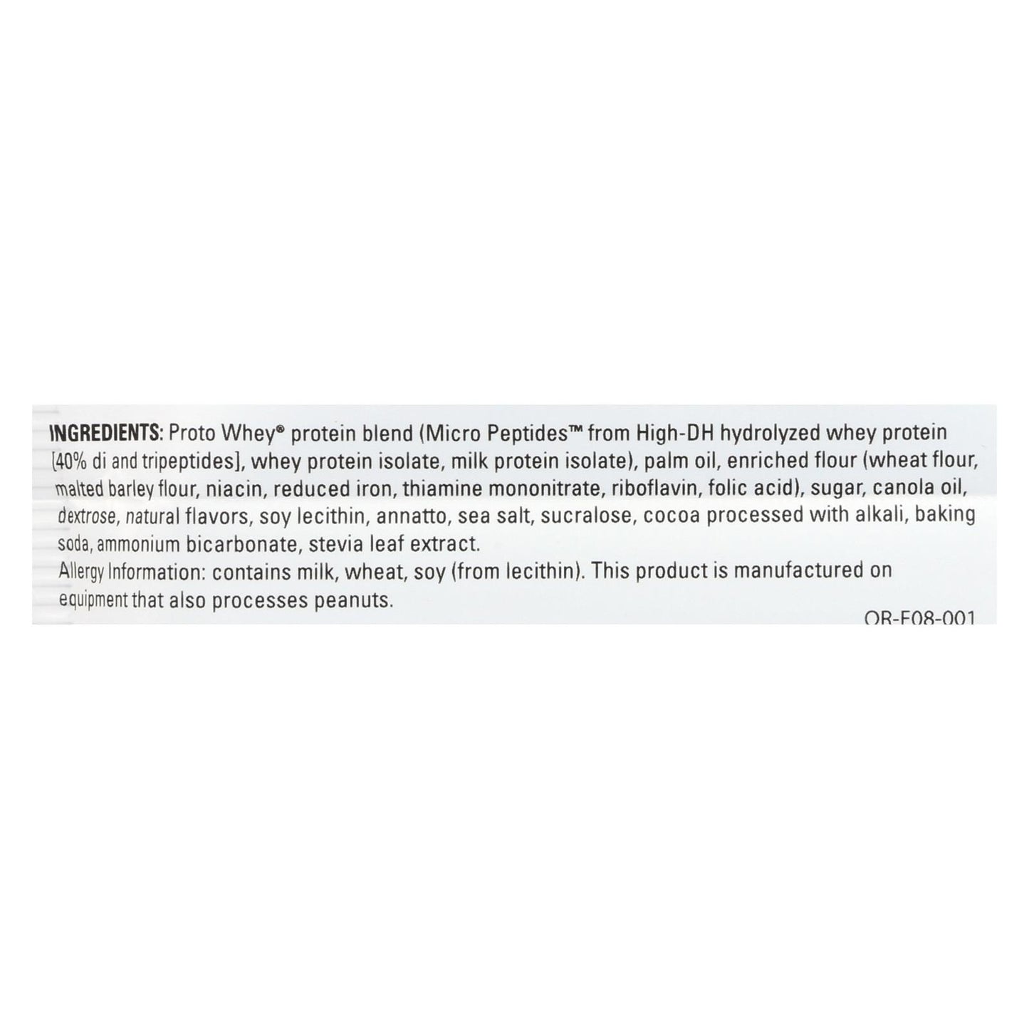 ingredients : proto whey® protein blend (micro peptides™ from high-dh hydrolyzed whey protein [40% di and tripeptides], whey protein isolate, milk protein isolate);palm oil;enriched flour (wheat flour, malted barley flour, niacin, reduced iron, thiamine mononitrate, riboflavin, folic acid);sugar;canola oil;dextrose;natural flavors;soy lecithin;annatto;sea salt;sucralose;cocoa processed with alkali;baking soda;ammonium bicarbonate;stevia leaf extract