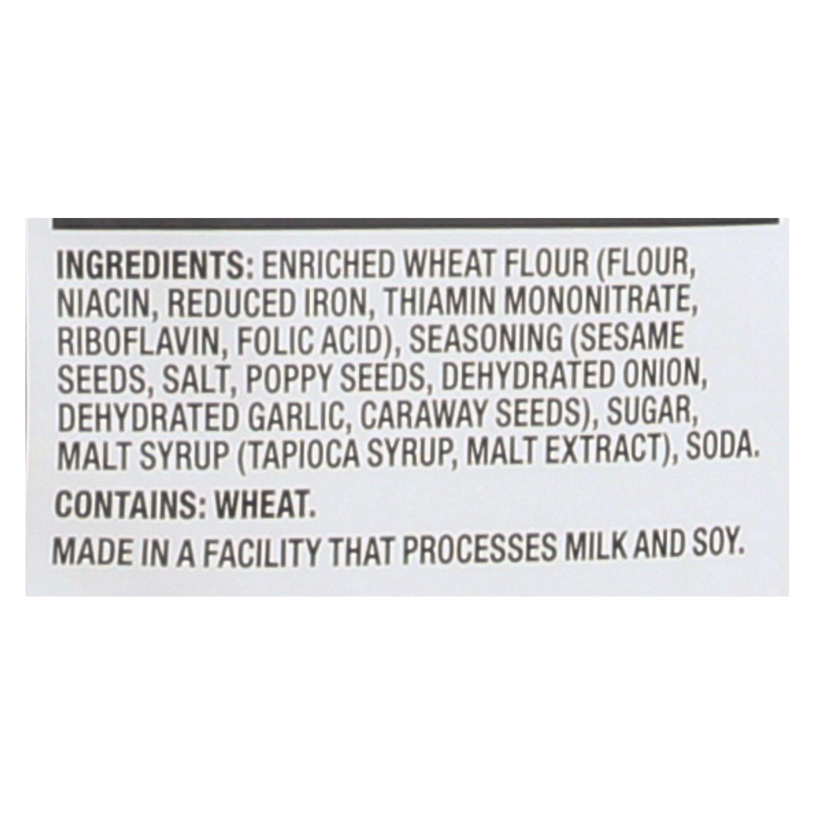 ingredients : enriched wheat flour;flour;niacin;reduced iron;thiamin mononitrate;riboflavin;folic acid;seasoning;sesame seeds;salt;poppy seeds;dehydrated onion;dehydrated garlic;carawav seeds;sugar;malt syrup;tapioca syrup;malt extract;soda