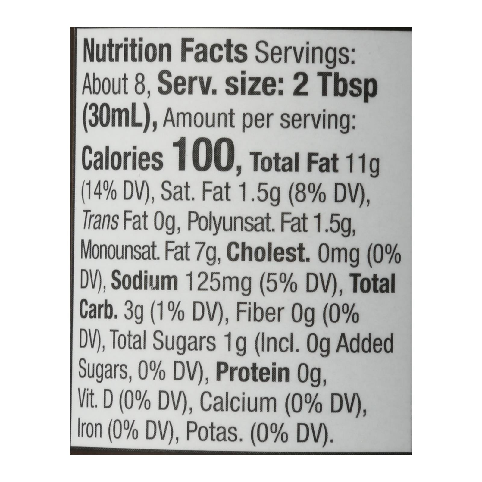 ingredients : organic balsamic vinegar (organic wine vinegar, organic concentrated grape must);avocado oil;water;sea salt;organic lemon juice concentrate;organic garlic powder;organic onion powder;konjac root;organic black pepper;organic dried basil;organic dried oregano