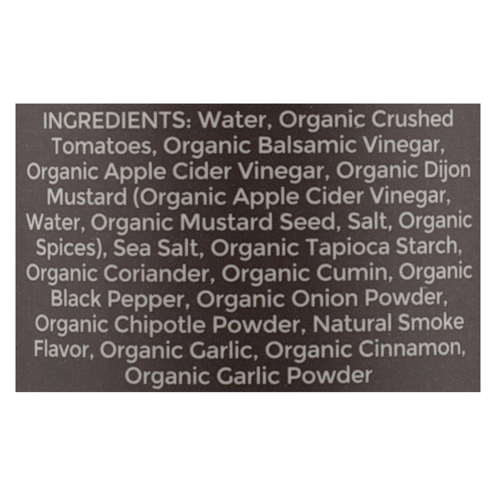 ingredients : water;organic tomato paste;organic date paste;organic apple cider vinegar;organic balsamic vinegar (organic wine vinegar, organic concentrated grape must);organic white balsamic vinegar (organic white wine vinegar, organic grape must);organic dijon mustard (organic apple cider vinegar, water, organic mustard seed, salt, organic spices);organic tapioca starch;organic fig solids;sea salt;organic onion powder;organic garlic powder;natural smoke flavor;organic black pepper;organic coriander;organic