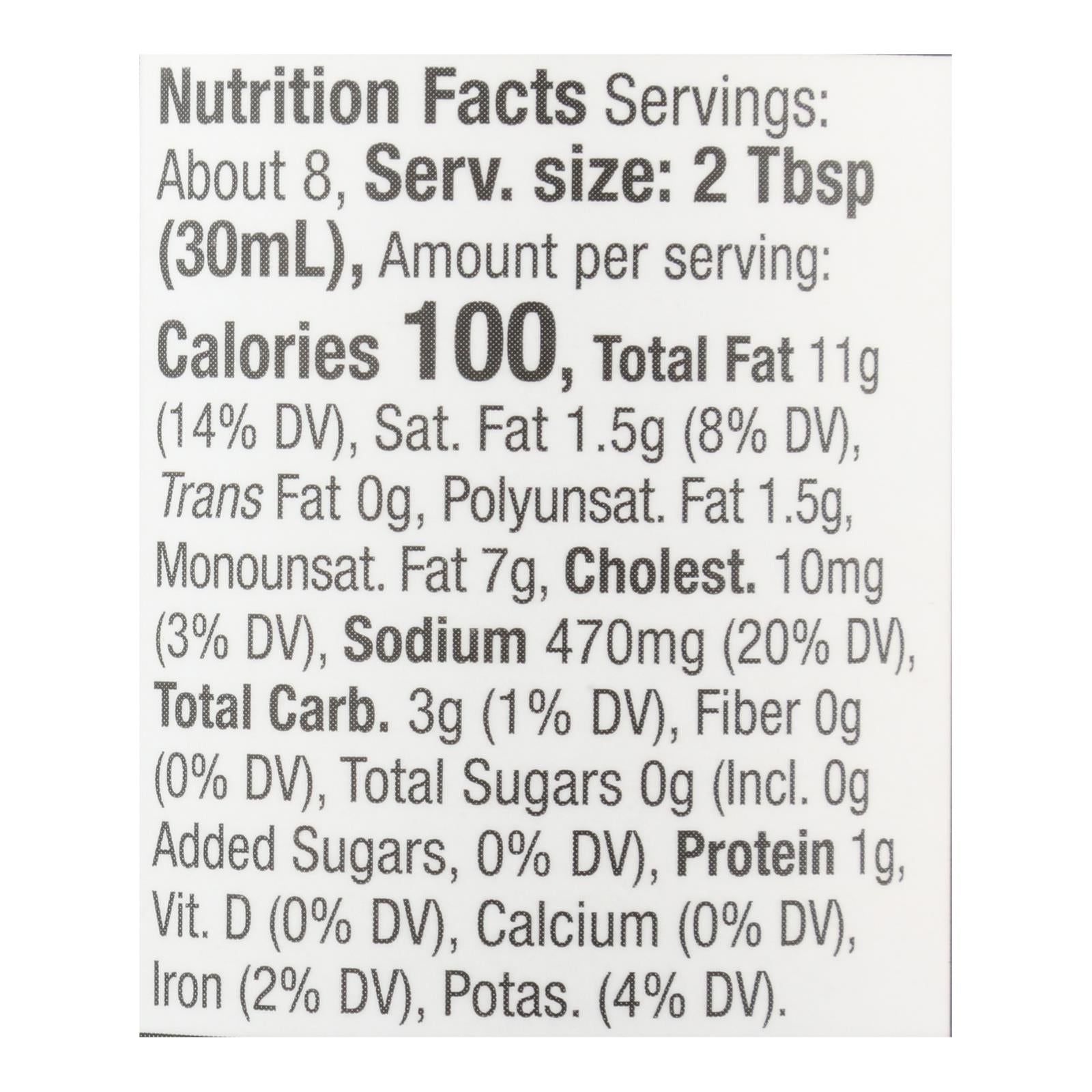ingredients : avocado oil;water;organic vinegar;organic apple cider vinegar;organic egg yolks;potato starch;sea salt;organic lemon juice concentrate;garlic powder;onion powder;nutritional yeast;citric acid;salt;tamarind seed gum;dried parsley;dried chives;organic dried dill;mushroom extract (to maintain freshness);organic black pepper;organic rosemary extract