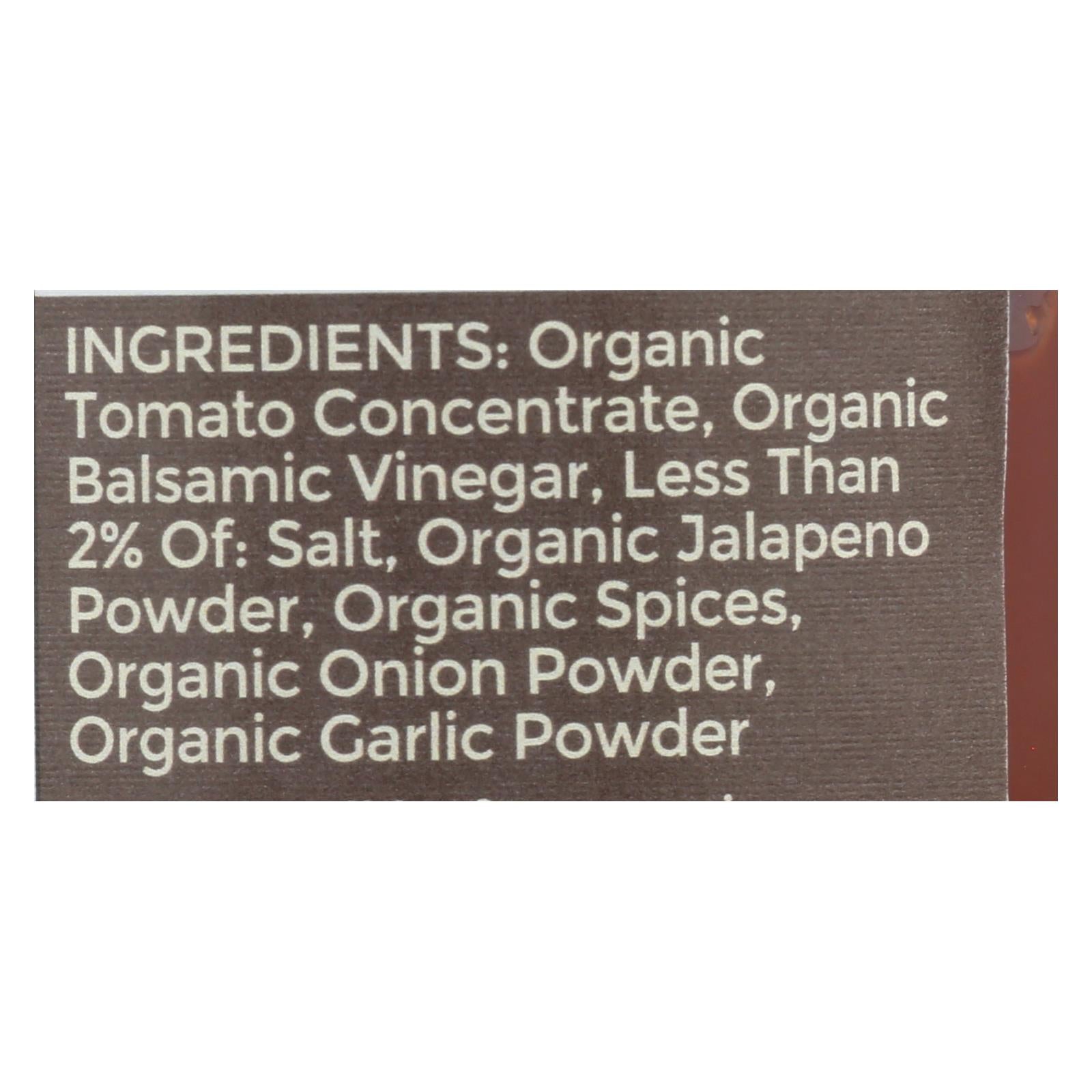 ingredients : organic tomato concentrate;organic balsamic vinegar (organic white wine vinegar, organic grape must);less than 2% of salt;organic jalapeno powder;organic spices;organic onion powder;organic garlic powder