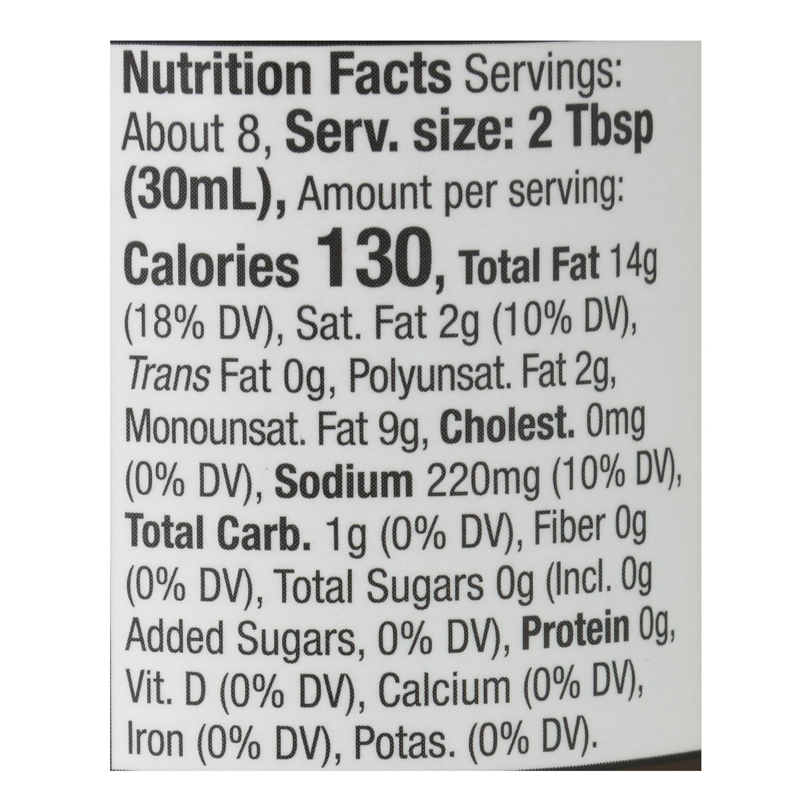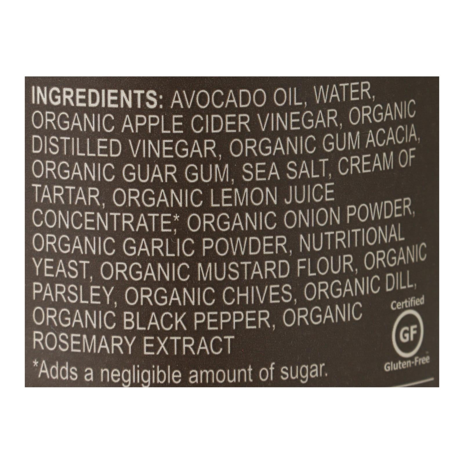 ingredients : avocado oil;water;organic apple cider vinegar;organic distilled vinegar;organic gum acacia;organic guar gum;sea salt;cream of tartar;organic lemon juice concentrate;organic onion powder;organic garlic powder;nutritional yeast;organic mustard flour;organic dried parsley;organic dried chives;organic dried dill;organic black pepper;organic rosemary extract