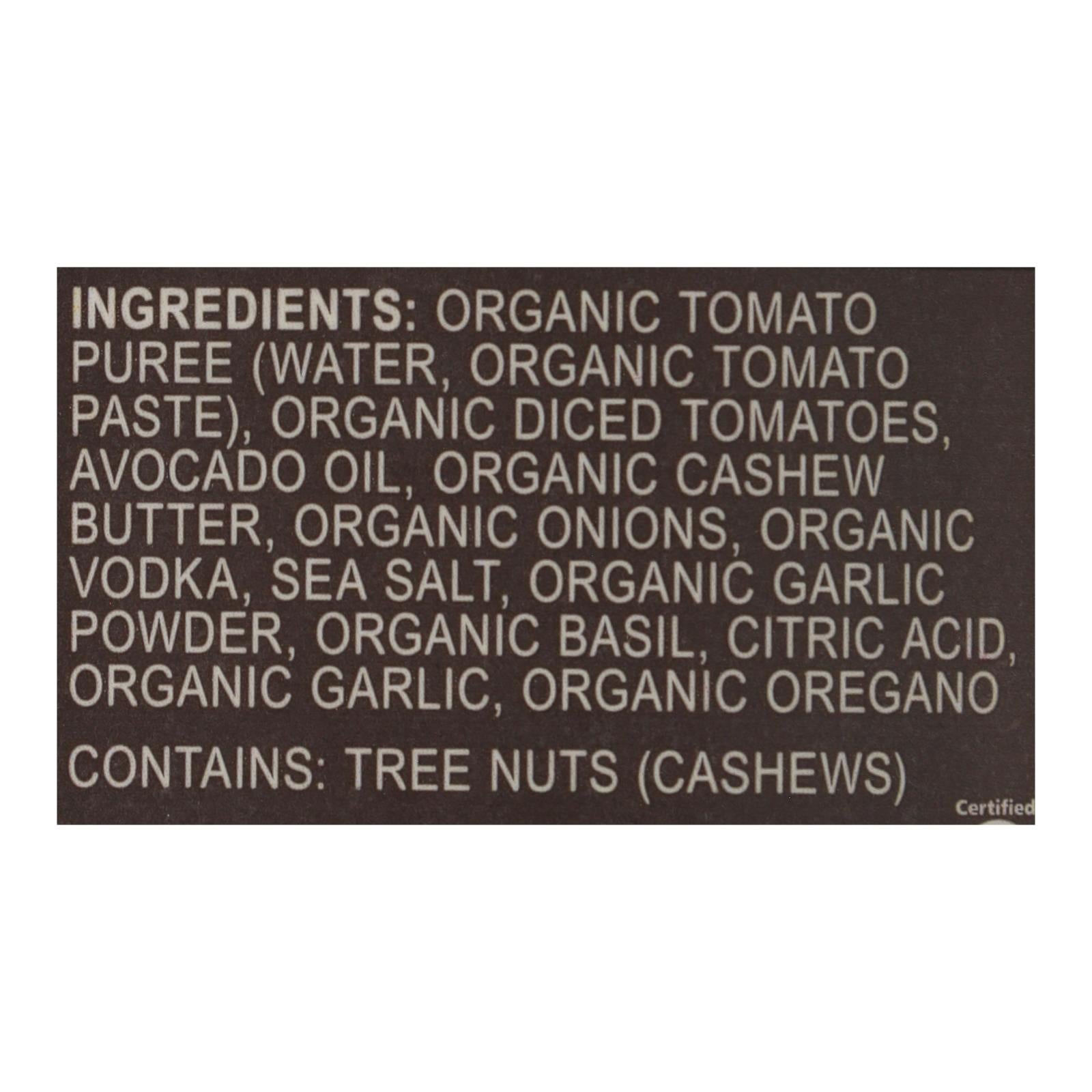 ingredients : organic tomato puree (water, organic tomato paste);organic diced tomatoes in organic tomato juice;avocado oil;pumpkin seed butter;organic onion;organic salted vodka;sea salt;citric acid;organic garlic powder;organic dried basil;organic garlic;organic dried oregano