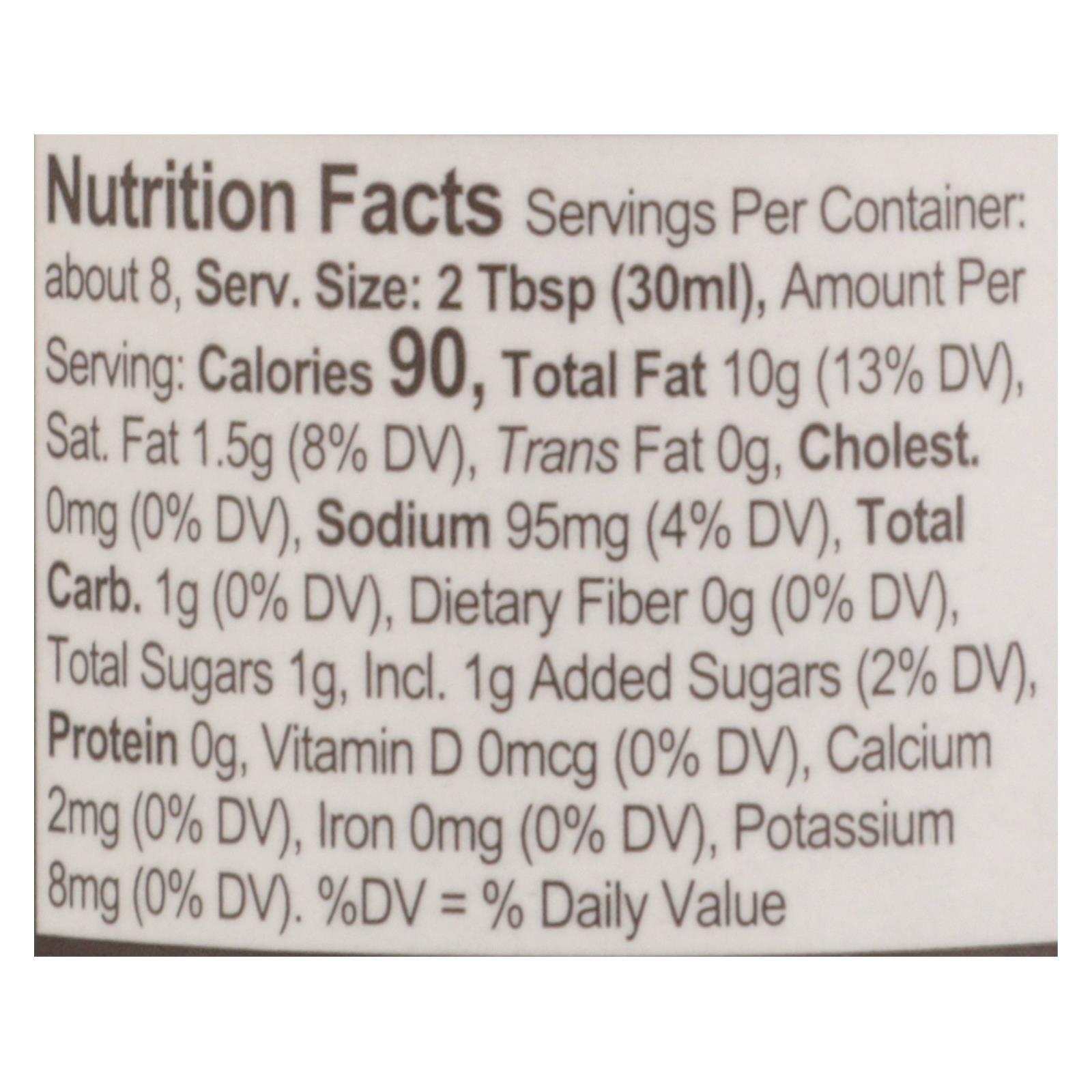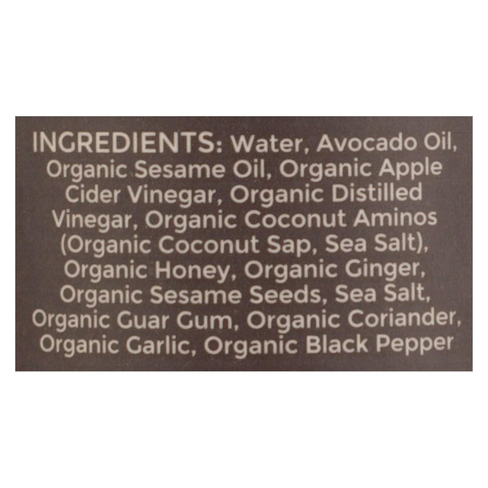 ingredients : water;avocado oil;organic vinegar;organic toasted sesame oil;organic apple cider vinegar;organic coconut aminos (water, organic coconut nectar, salt);organic honey;ginger;organic ginger powder;organic sesame seeds;sea salt;organic guar gum;organic ground coriander;minced garlic;organic black pepper;mushroom extract (to maintain freshness)