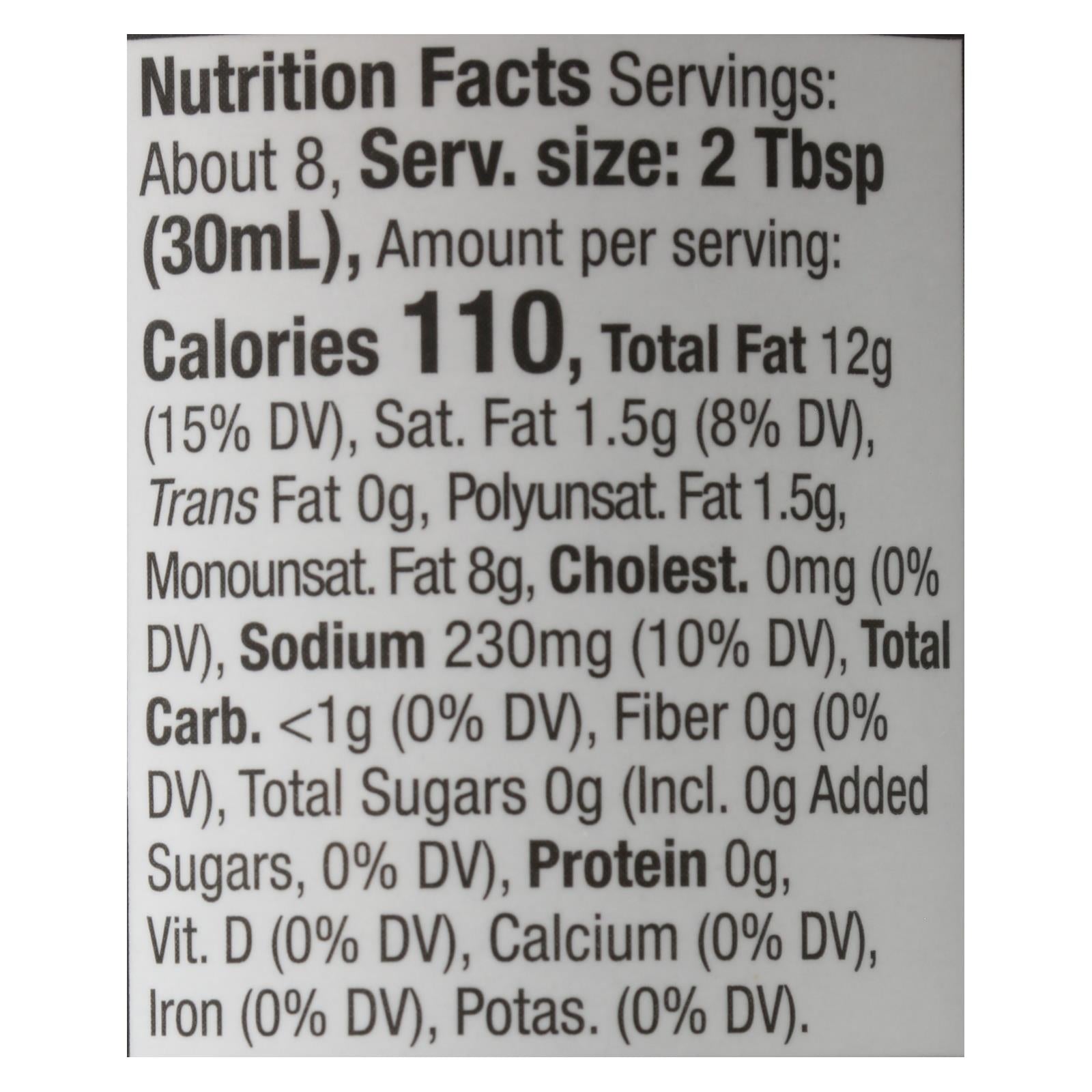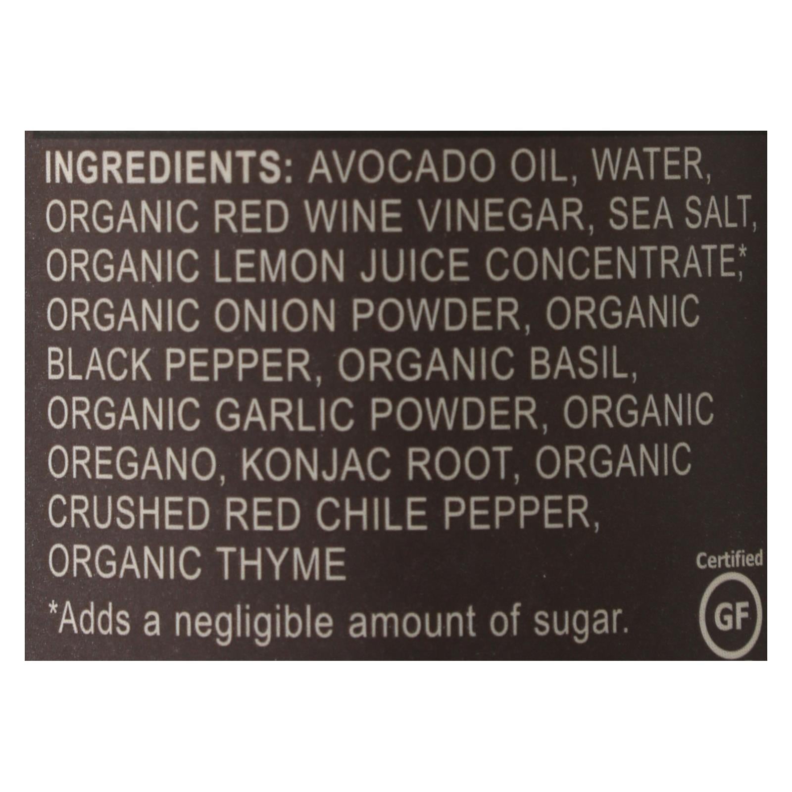 ingredients : avocado oil;water;organic red wine vinegar;sea salt;organic lemon juice concentrate;organic onion powder;organic black pepper;organic dried basil;organic garlic powder;organic dried oregano;konjac root;organic dried crushed red chile pepper;organic dried thyme