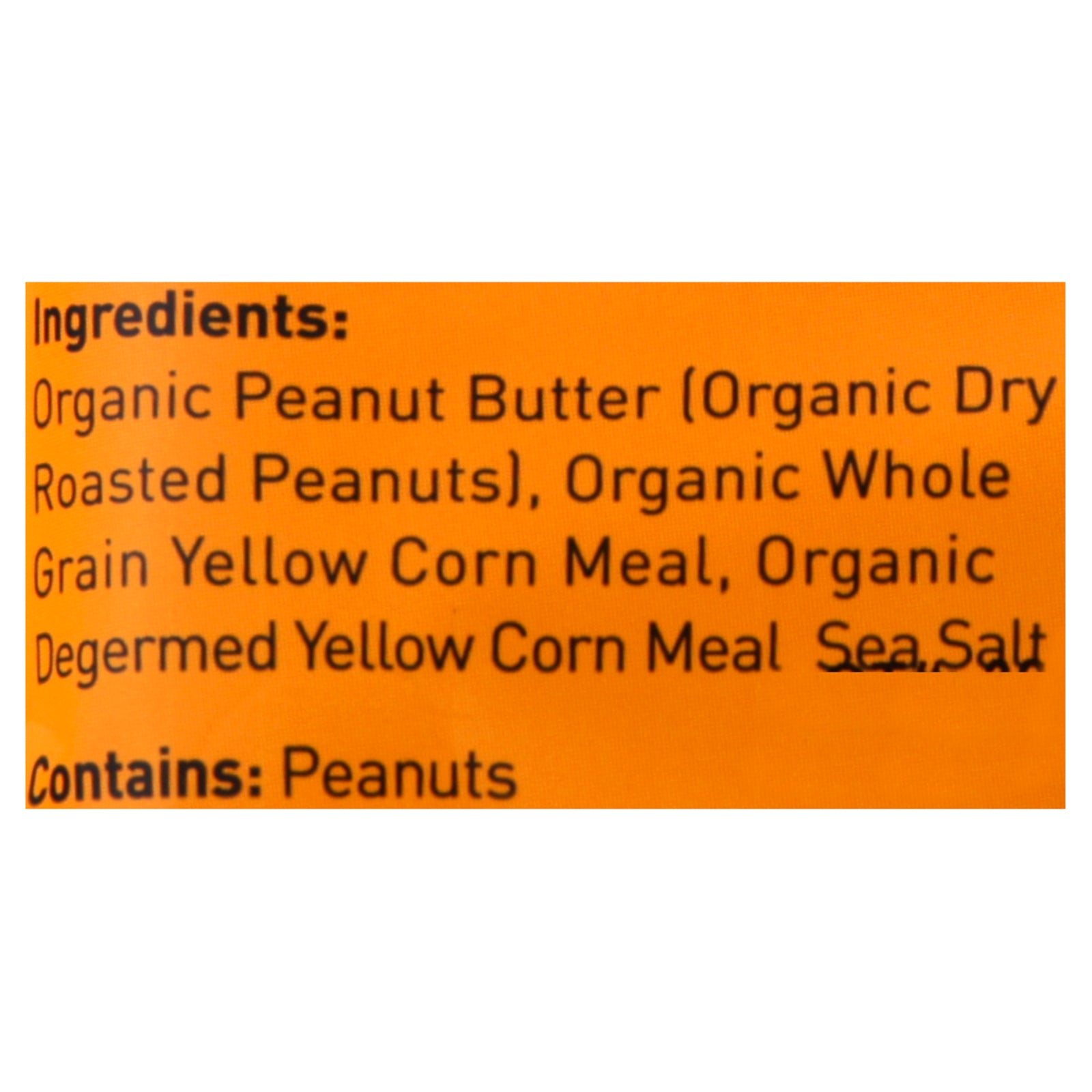ingredients : organic peanut butter (organic dry roasted peanuts);organic whole grain yellow corn meal;organic degermed yellow corn meal;sea salt