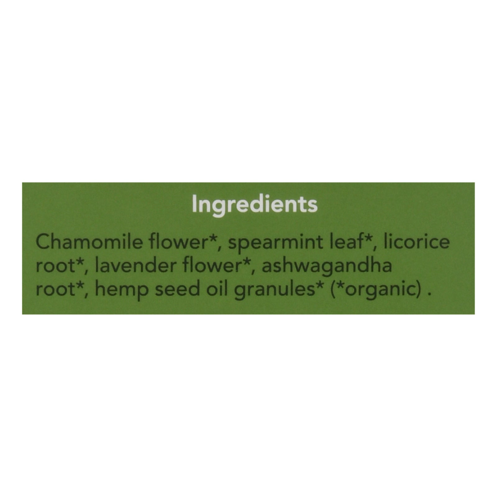 ingredients : chamomile flower;spearmint leaf;licorice root;lavender flower;ashwagandha root;hemp seed oil granules