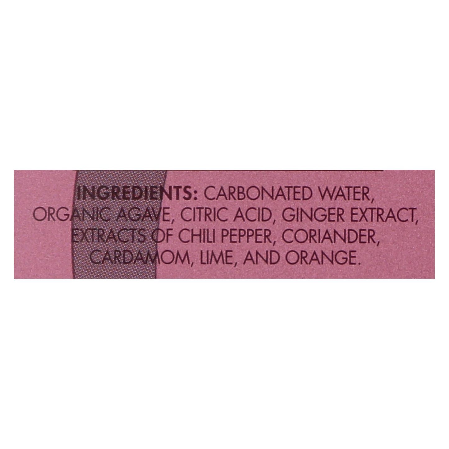ingredients : carbonated water;organic agave;citric acid;ginger extract;extracts of chili pepper;coriander;cardamom;lime;and orange