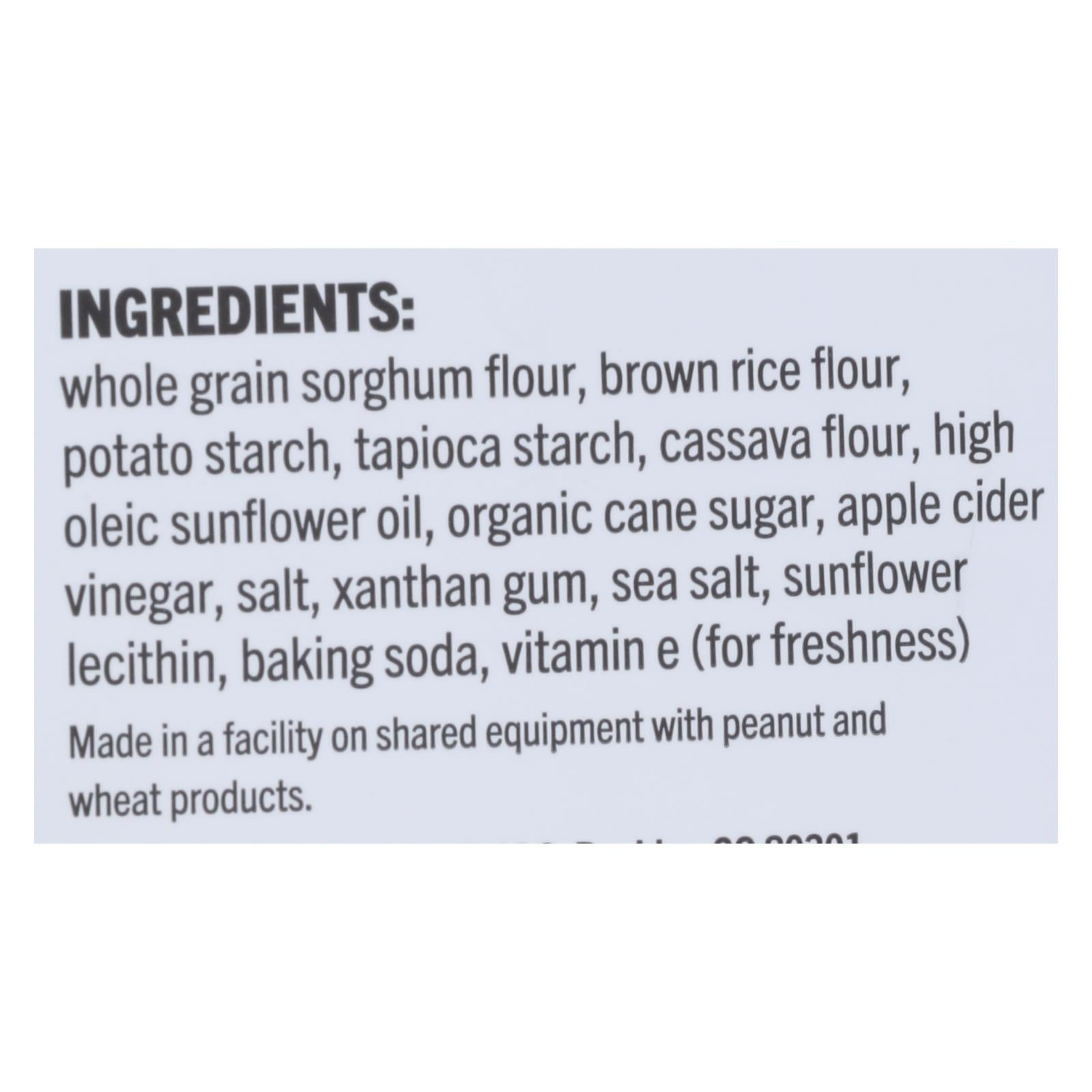 ingredients : whole grain sorghum flour;brown rice flour;potato starch;tapioca starch;cassava flour;high oleic sunflower oil;organic invert sugar;salt;apple cider vinegar (diluted with water to 5% acidity);xanthan gum;sunflower lecithin;baking soda;mixed tocopherols (to retain freshness)