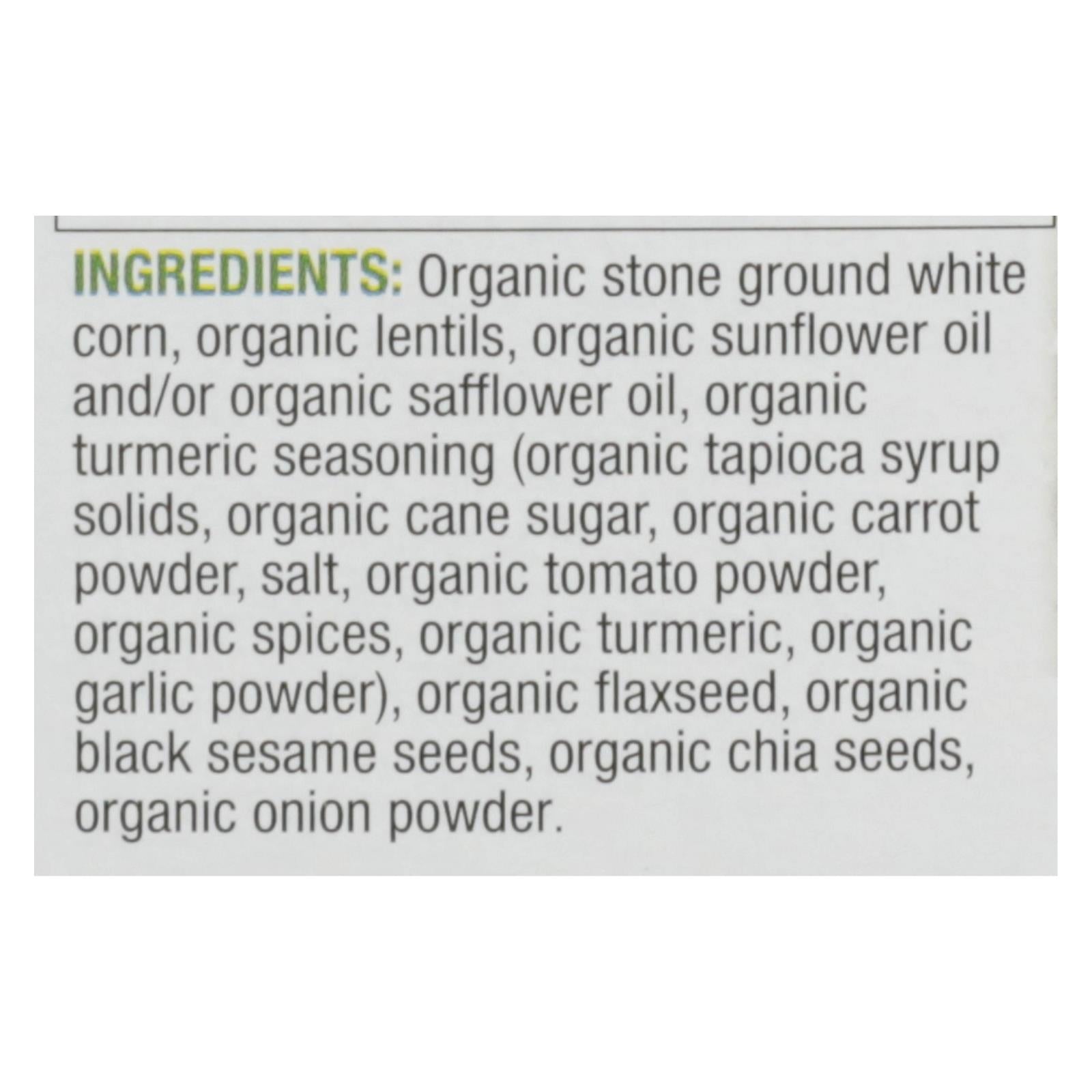 ingredients : organic stone ground white corn;organic lentils;organic sunflower oil and/or organic safflower oil;organic turmeric seasoning;organic tapioca syrup solids;organic cane sugar;organic carrot powder;salt;organic tomato powder;organic spices;organic turmeric;organic garlic powder;organic flaxseed;organic black sesame seeds;organic chia seeds;organic onion powder
