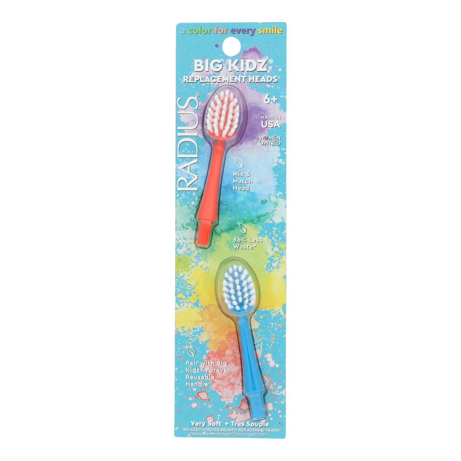 A color for every smile. Mix & match head. 86% less waste (compared to non replacement head toothbrushes). Pair with big kidz forever reusable handle. Very soft. Tres souple. Big kidz forever brush replacement heads. Bio-based bristles (bio based bristles produced using renewable feedstock is renewable). The renewable portion of the feedback comes from castor beans. Wider bristle bed cleans larger area in less time. Pillow soft, bio-based bristles gently remove plaque & tartar (bio-based bristles produced using renewable feedstock is renewable). Mix & match! choose the color combo that fits your personality! slim neck for hard to reach spaces. Keep handle, replace the head! help us keep the earth as clean as your teeth! reversible right & left hand, non-slip grip for better brushing. Recyclable. Plant based. Cruelty-free. Women owned.