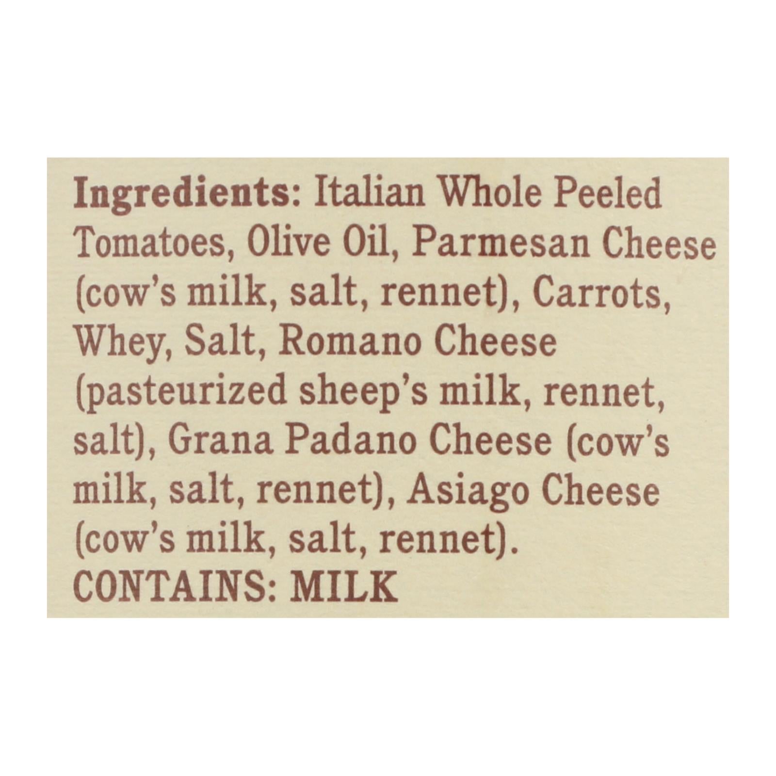 ingredients : italian whole peeled tomatoes;olive oil;parmesan cheese (cow's milk, salt, rennet);carrots;whey;salt;romano cheese (pasteurized sheep's milk, rennet, salt);grana padano cheese (cow's milk, salt, rennet);asiago cheese (cow's milk, salt, rennet)