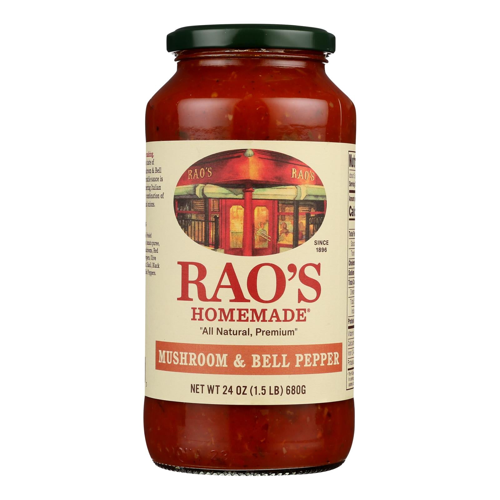Rao's peppers & mushrooms pasta sauce is made in italy and features italian tomatoes, mushrooms, onions, and peppers. Every 24 oz. Jar of rao's pasta pepper & mushroom sauce has 0 g. Of trans fat and cholesterol. Every 1/2-cup serving of rao's provides 15% of the daily recommended value of vitamin a and 30% of the daily recommended value of vitamin c, and contains just 70 calories.