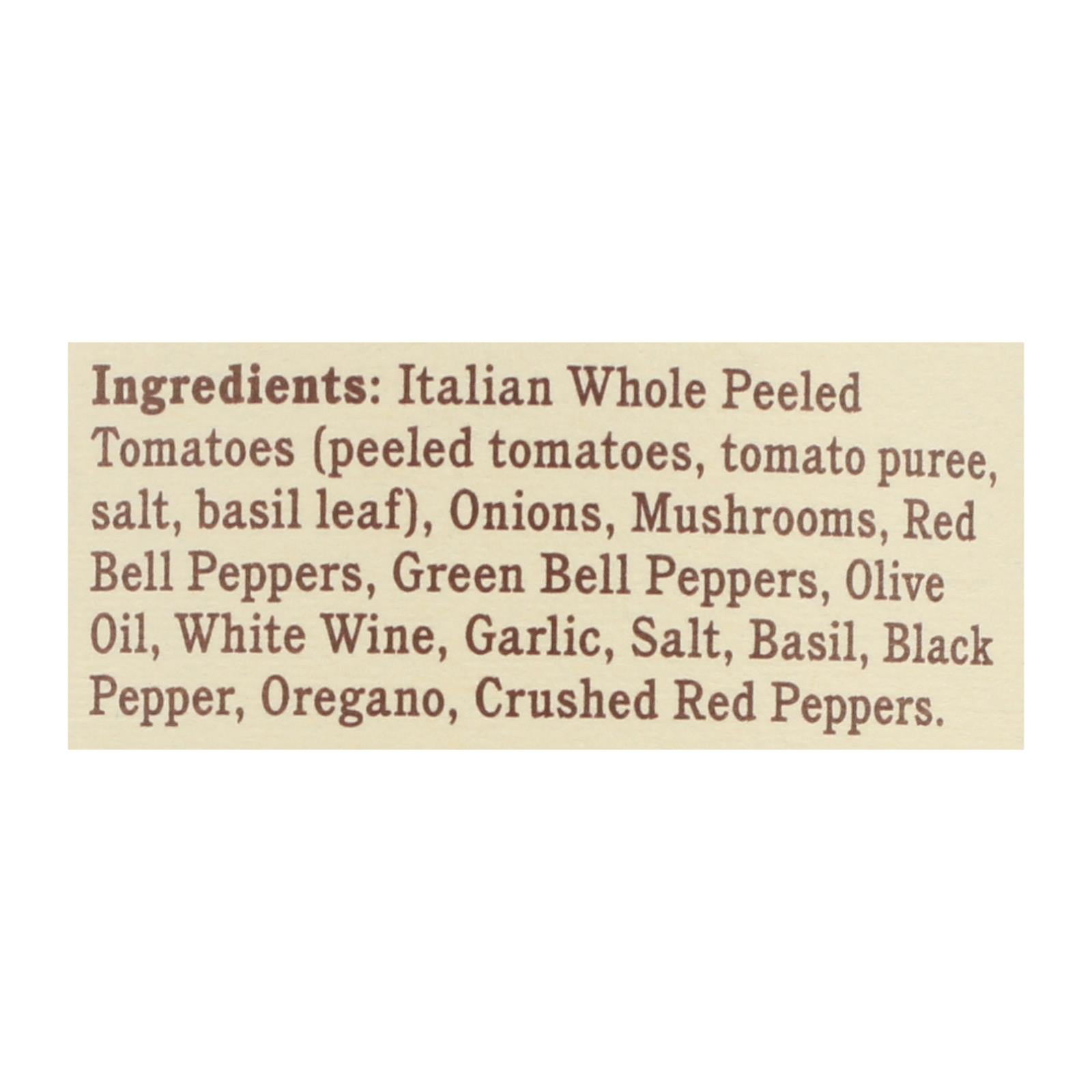 ingredients : italian whole peeled tomatoes (peeled tomatoes, tomato puree, salt, basil leaf);onions;mushrooms;red bell peppers;green bell peppers;olive oil;white wine;garlic;salt;basil;black pepper;oregano;crushed red peppers